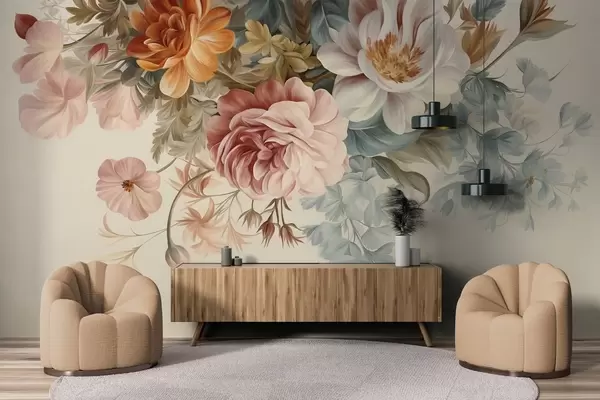 Papier peint Composition florale vintage avec des roses, des pivoines et d'autres fleurs texturées accompagnées de feuillage, sur un fond clair. N° w09532