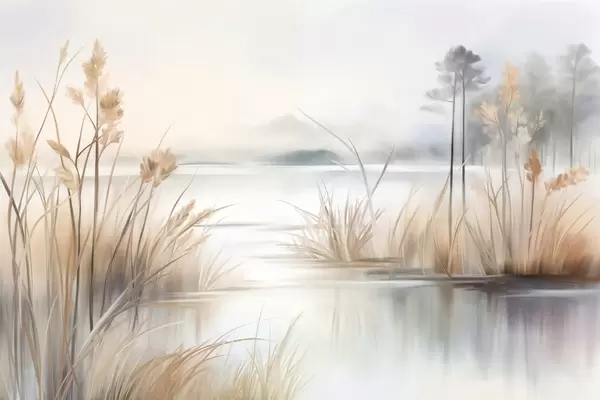 Papier peint Paysage avec un lac et de hautes herbes au premier plan, des montagnes à l'arrière-plan, des couleurs douces, texturé N° w09534