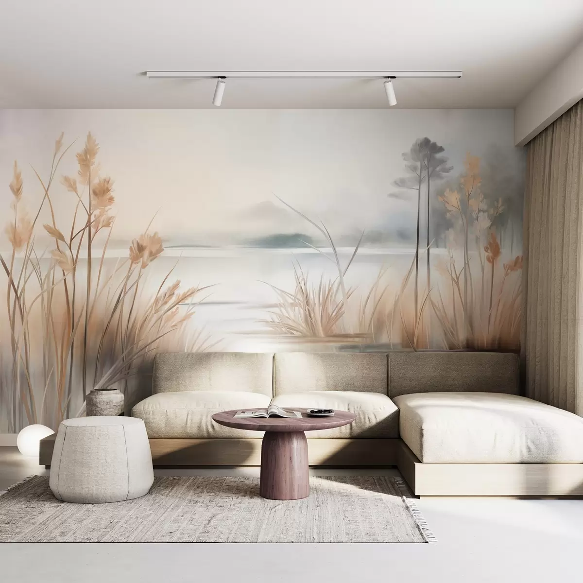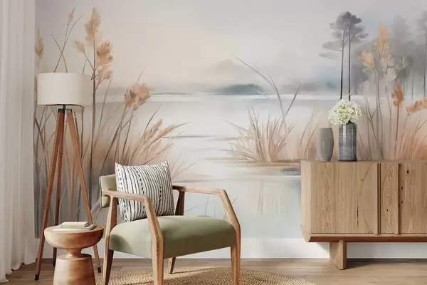 Papier peint Paysage avec un lac et de hautes herbes au premier plan, des montagnes à l'arrière-plan, des couleurs douces, texturé N° w09534