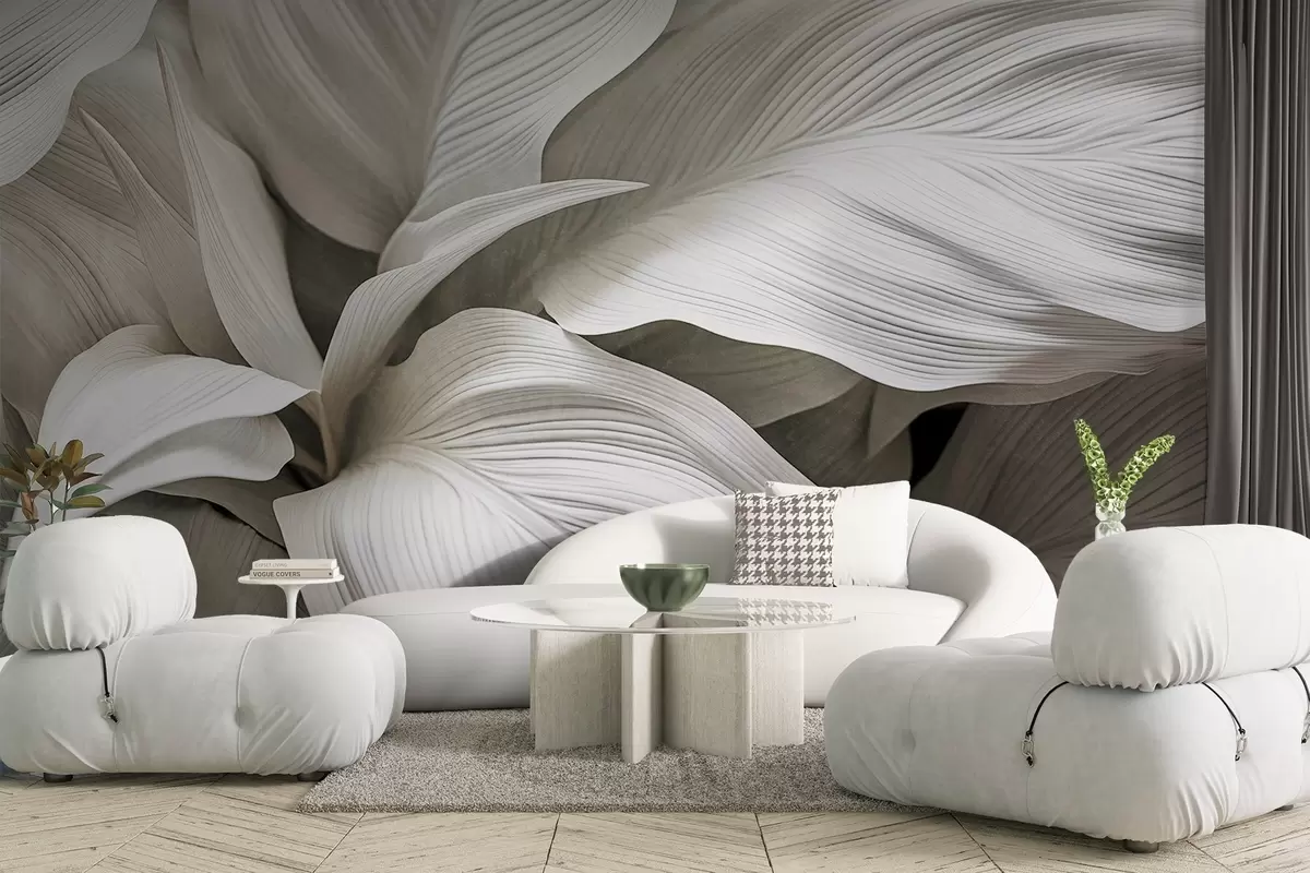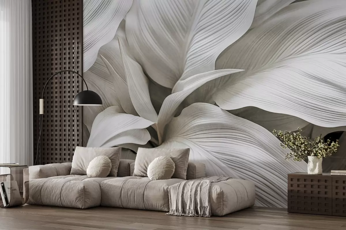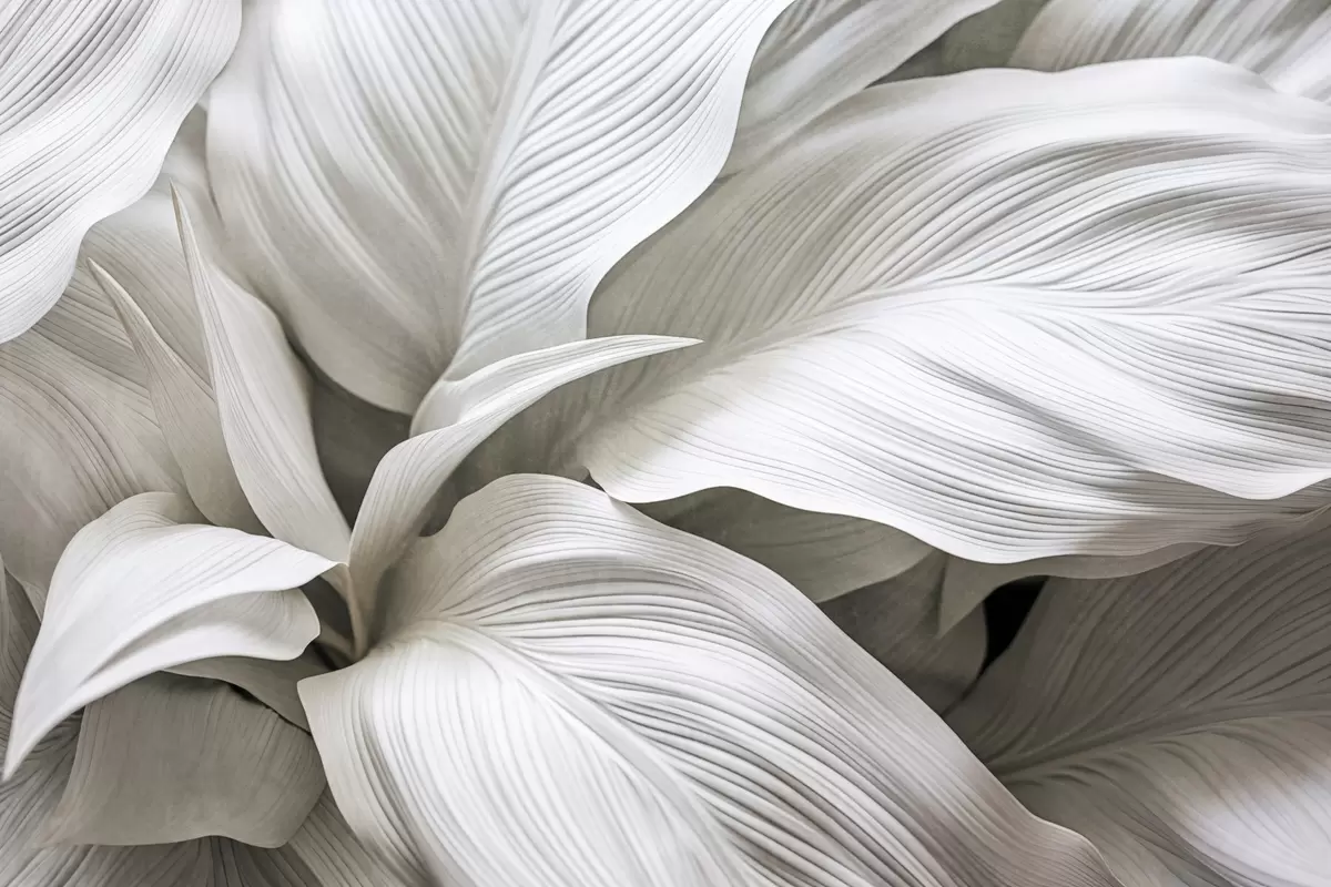 Papier peint Grandes feuilles blanches texturées avec des nervures proéminentes, qui se chevauchent et créent de la profondeur. N° w09536
