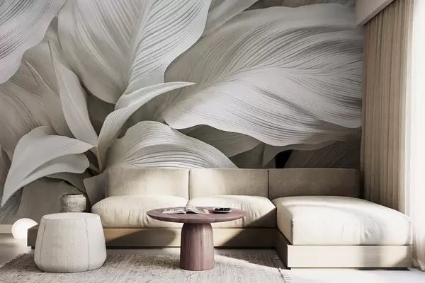 Papier peint Grandes feuilles blanches texturées avec des nervures proéminentes, qui se chevauchent et créent de la profondeur. N° w09536