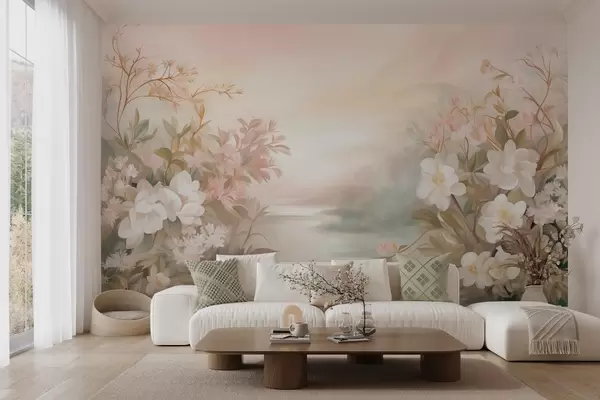 Papier peint Un paysage avec une rivière entourée de fleurs et de plantes, des couleurs douces, un ciel rose, un style aquarelle texturé. N° w09537