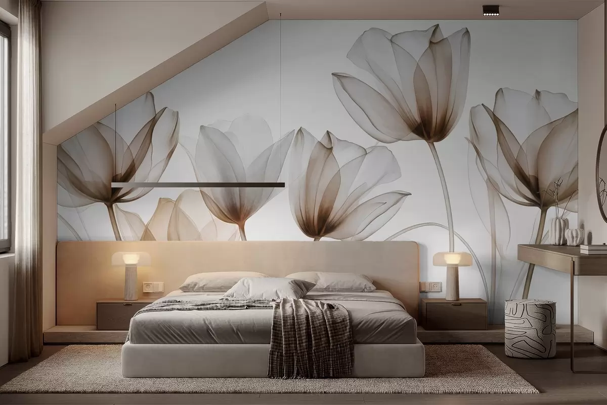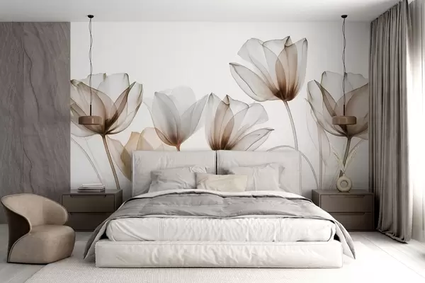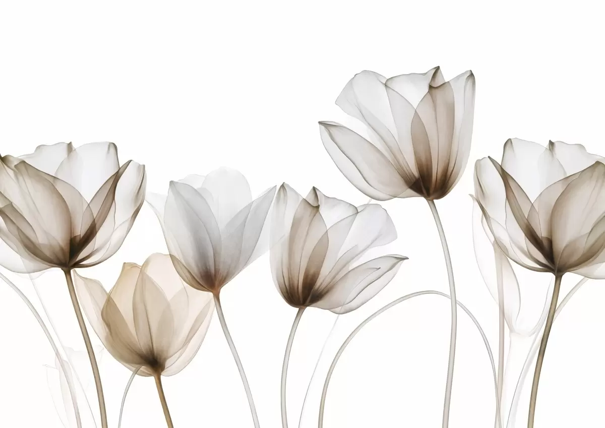 Papier peint Fleurs de tulipes translucides brunes et blanches à longues tiges, sur fond clair, art floral délicat et texturé N° w09538v1