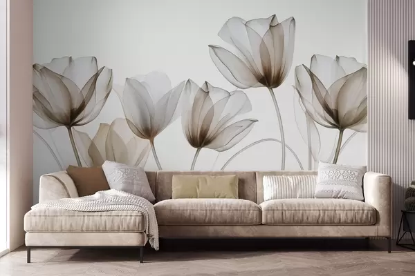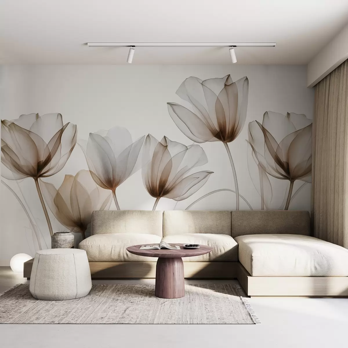 Papier peint Fleurs de tulipes translucides brunes et blanches à longues tiges, sur fond clair, art floral délicat et texturé N° w09538v1
