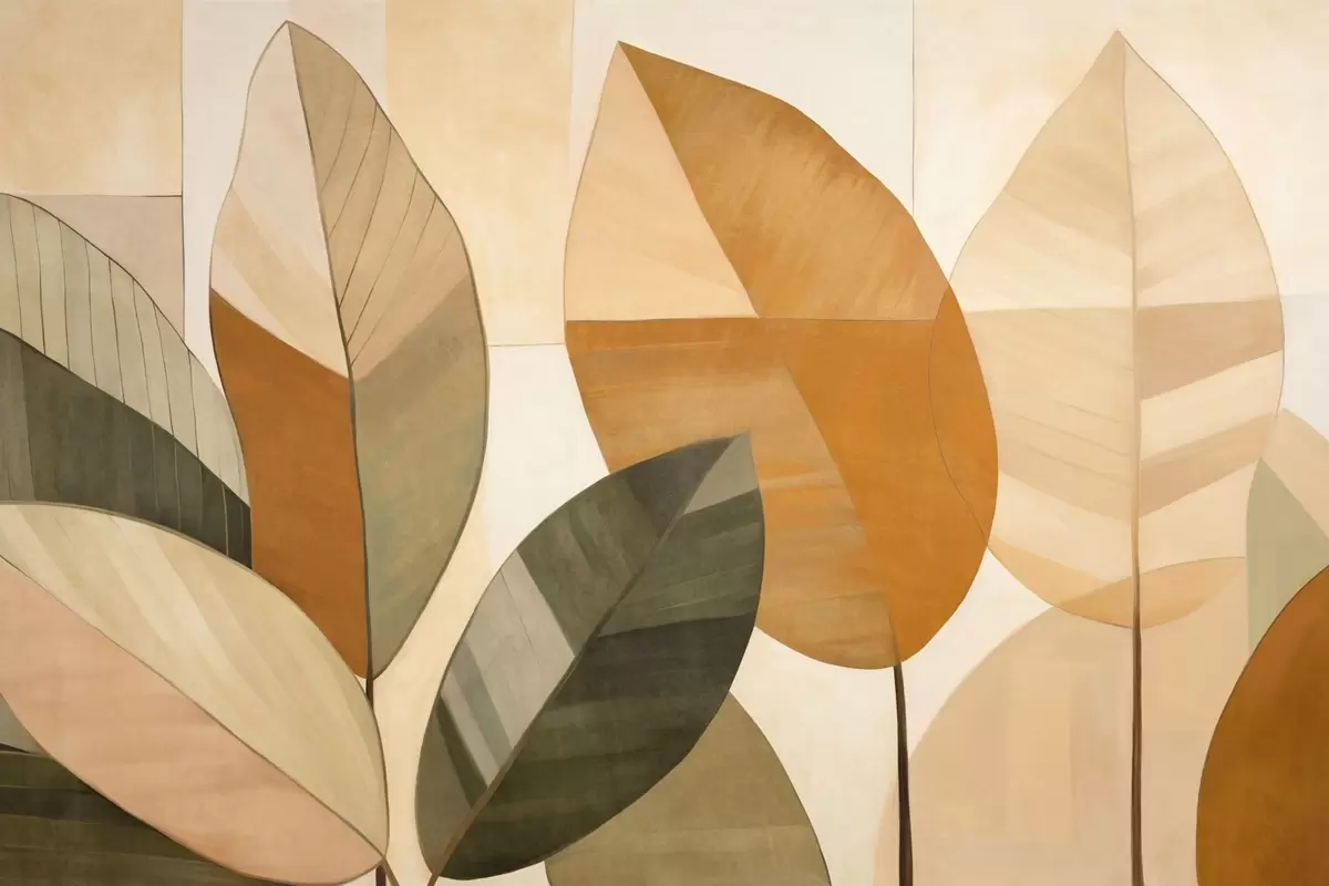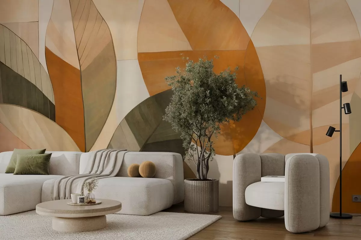 Papier peint Feuilles abstraites de grande taille dans des tons orange, marron et vert, texturées, disposées sur un fond clair. N° w09539