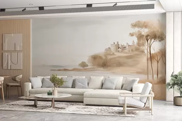 Papier peint Paysage avec un château sur une colline près de la mer, une plage de sable au premier plan, couleurs douces, art texturé N° w09540