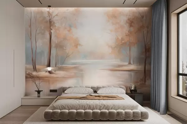 Papier peint Paysage automnal texturé avec des arbres et une rivière, couleurs douces, atmosphère légère et aérienne, scène paisible et tranquille. N° w09541