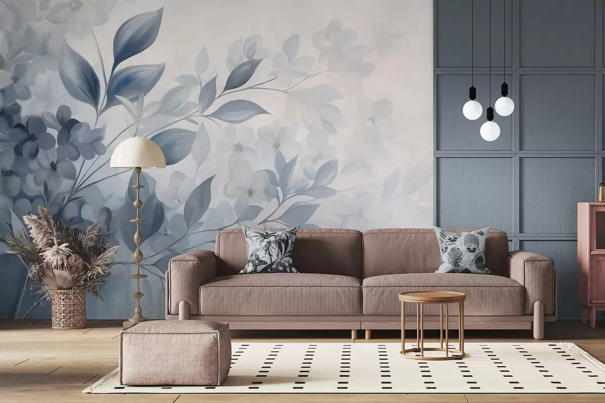 Papier peint Branche bleue et blanche texturée avec des fleurs et des feuilles se fondant dans un fond clair peint à l'aquarelle. N° w09543