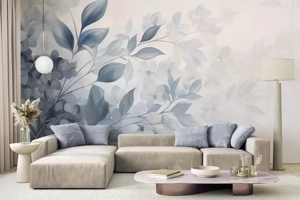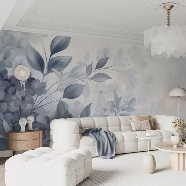 Papier peint Branche bleue et blanche texturée avec des fleurs et des feuilles se fondant dans un fond clair peint à l'aquarelle. N° w09543