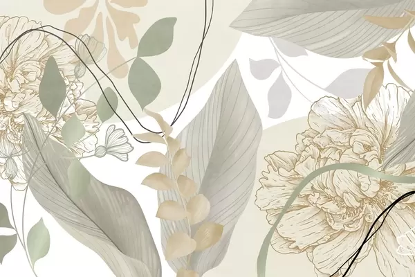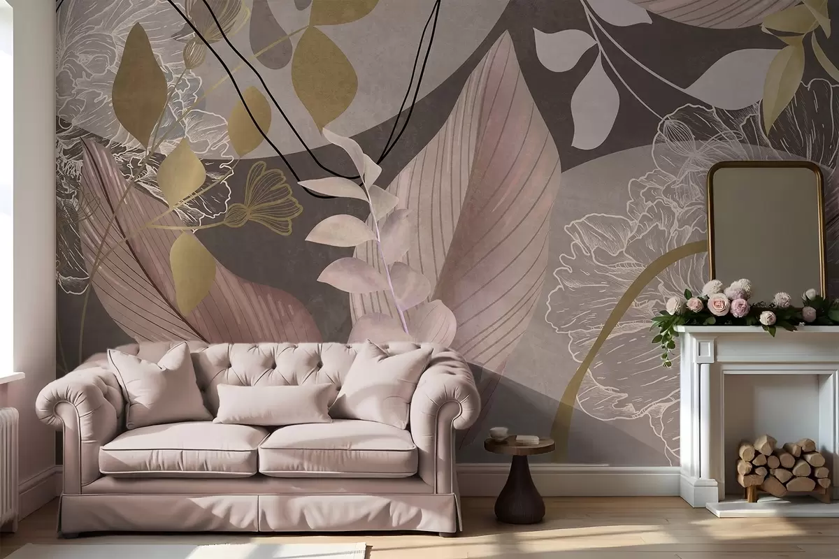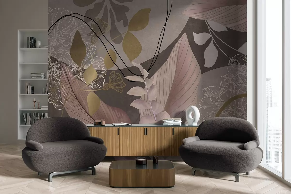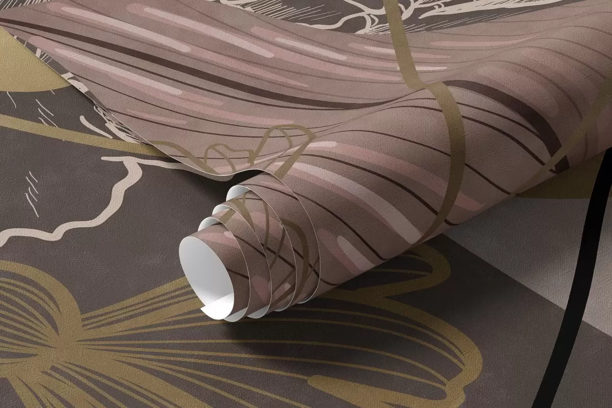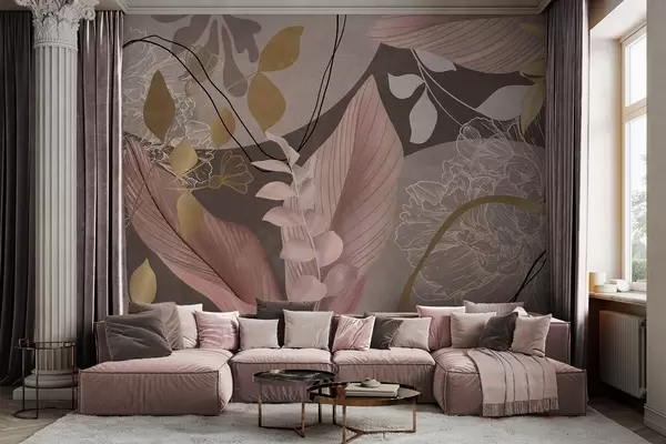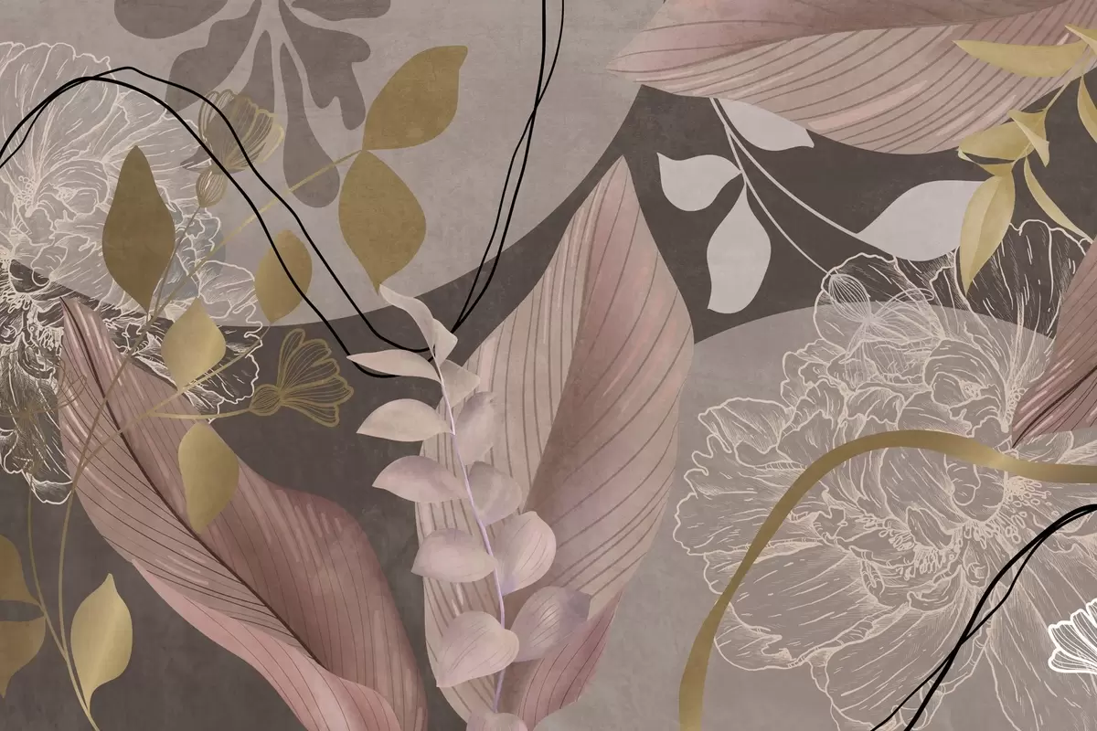 Papier peint Imprimé floral abstrait avec de grandes feuilles dans des tons de rose pâle et de brun, rehaussé de fines lignes noires et de contours floraux blancs. N° w09544