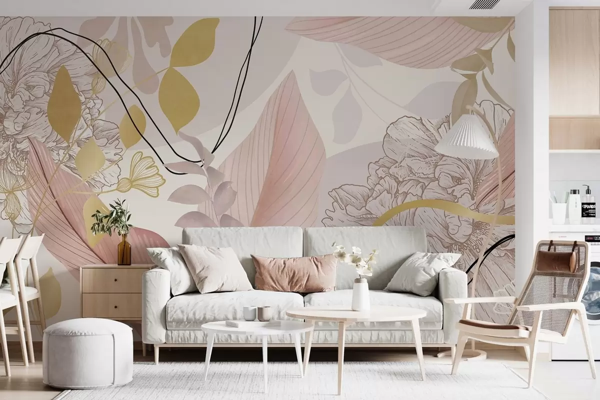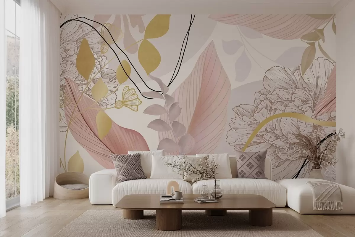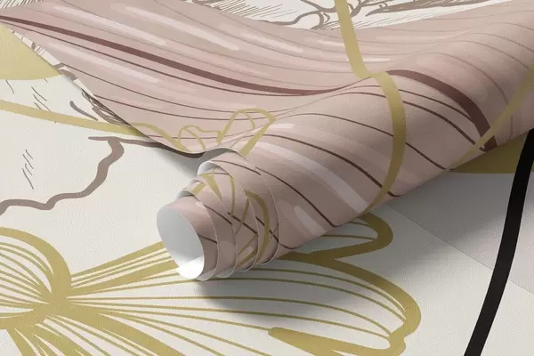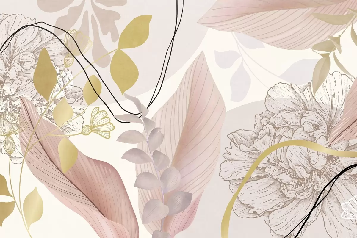 Papier peint Imprimé floral abstrait avec de grandes feuilles dans des tons de rose pâle, jaune avec de fines lignes noires et des contours floraux blancs. N° w09544v1