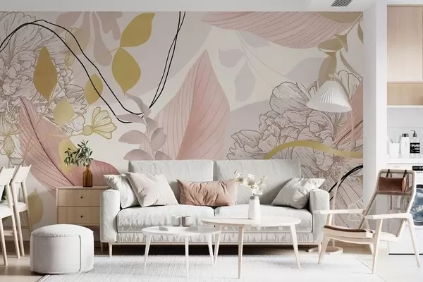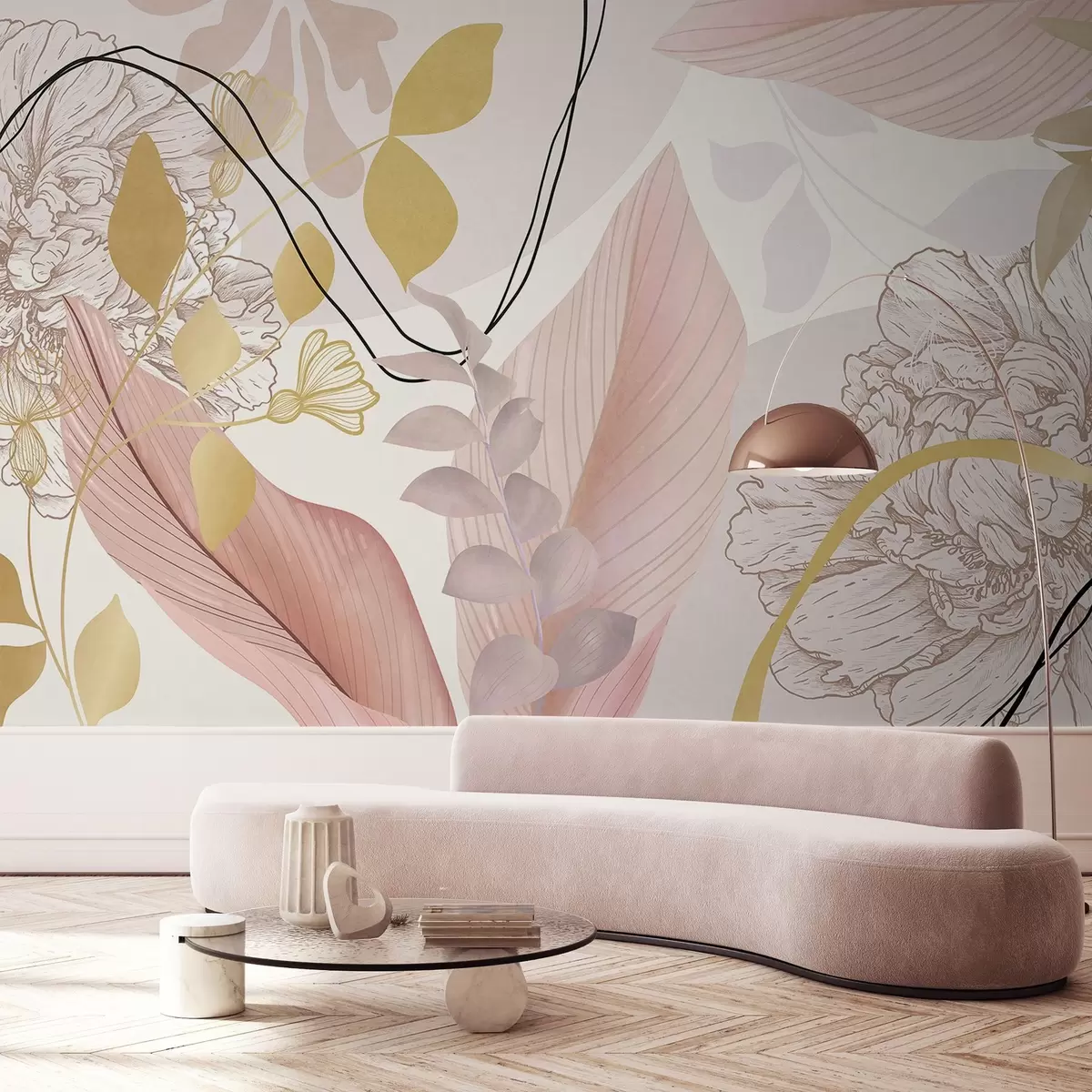 Papier peint Imprimé floral abstrait avec de grandes feuilles dans des tons de rose pâle, jaune avec de fines lignes noires et des contours floraux blancs. N° w09544v1