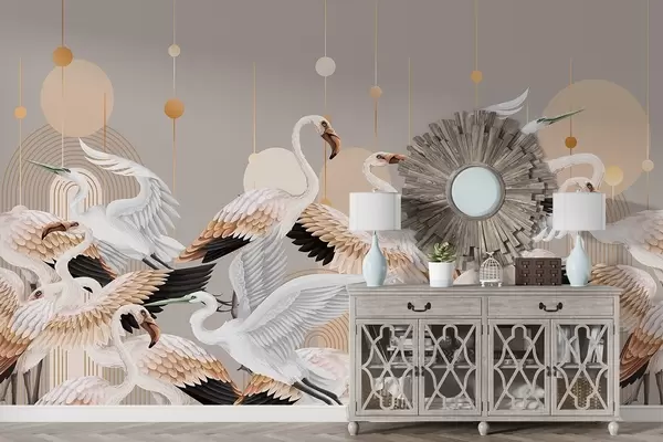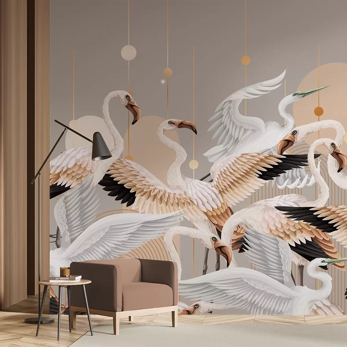 Papier peint Un groupe de flamants roses blancs aux ailes délicates, sur un fond neutre avec des lignes et des cercles jaunes N° w09546v1