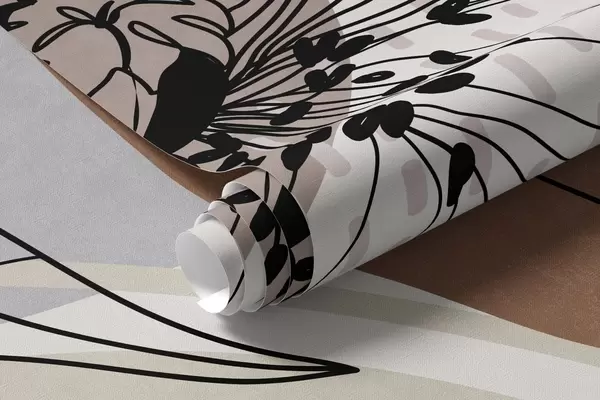 Papier peint Imprimé abstrait à motifs floraux texturés avec des fleurs, des feuilles et des formes organiques dessinées au trait dans des tons bruns, beiges et gris discrets. N° w09548