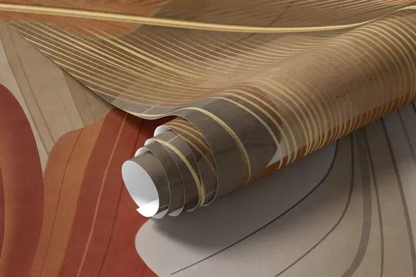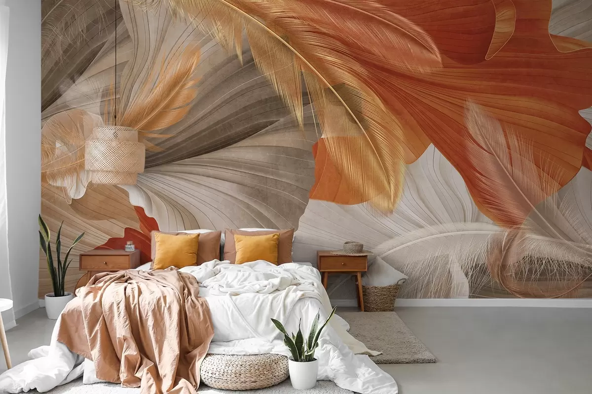 Papier peint Formes abstraites texturées, fluides, de couleur crème et rouille, ornées de délicates plumes jaunes, beiges et brunes. N° w09549