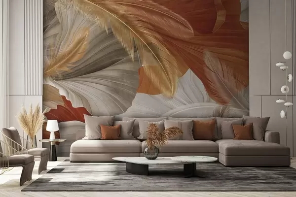 Papier peint Formes abstraites texturées, fluides, de couleur crème et rouille, ornées de délicates plumes jaunes, beiges et brunes N° w09549