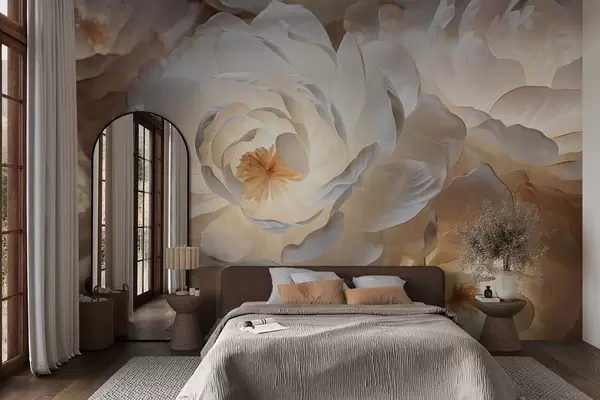 Papier peint Grandes fleurs de pivoine fantaisie blanches au cœur jaune, éclairage tamisé et pétales délicats et texturés superposés. N° w09550