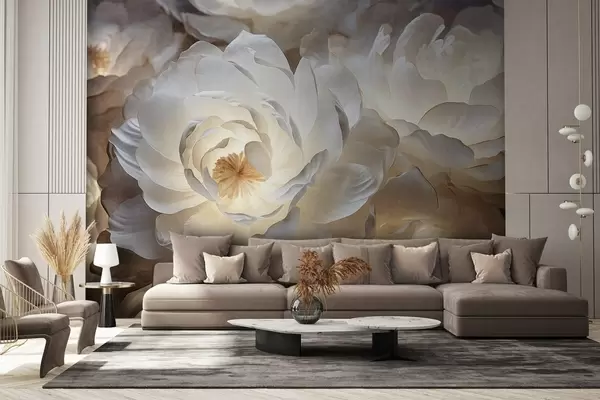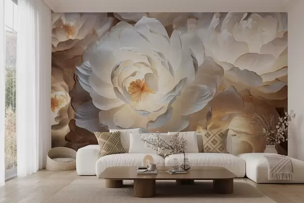 Papier peint Grandes fleurs de pivoine fantaisie blanches au cœur jaune, éclairage tamisé et pétales délicats et texturés superposés. N° w09550