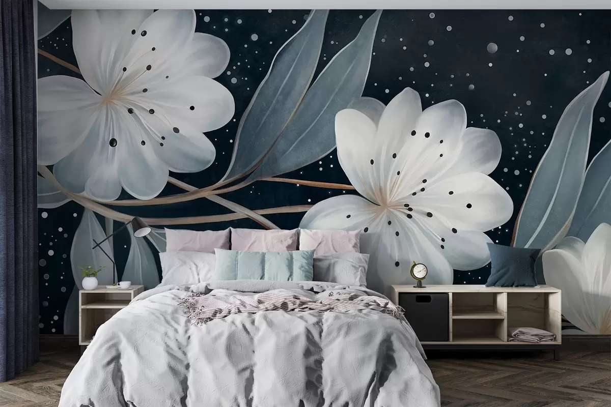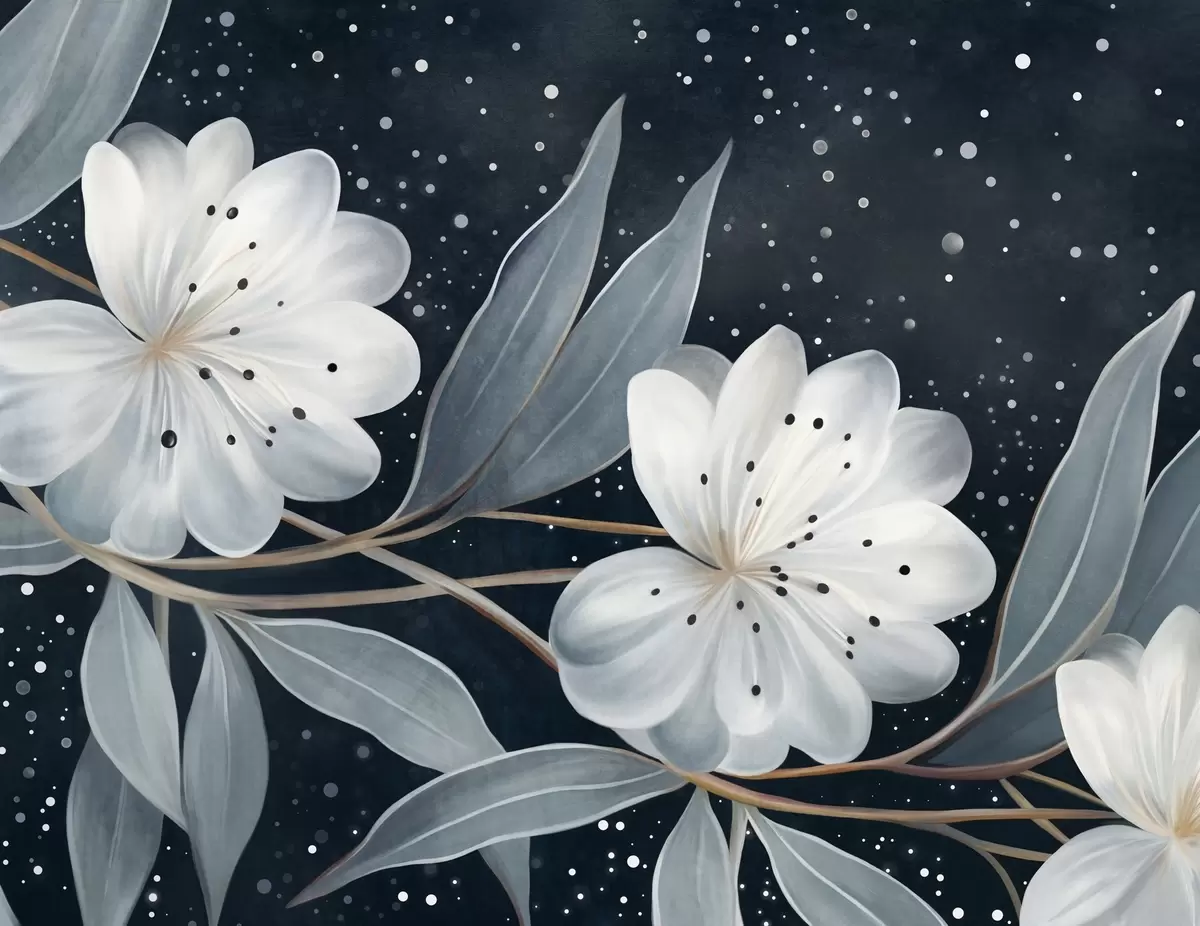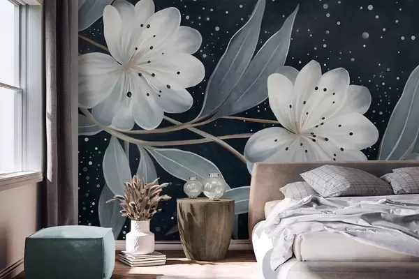 Papier peint Fleurs blanches fantaisistes texturées, entourées de feuilles et de branches bleu-vert sur fond sombre N° w09551
