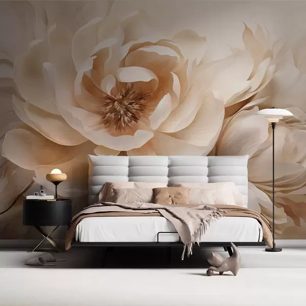 Papier peint Pivoines à la texture crémeuse avec un cœur brun et des feuilles sur un fond abstrait flou et clair. N° w09554
