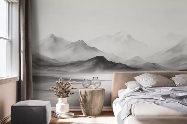 Papier peint Paysage monochrome texturé avec des montagnes brumeuses et un lac au premier plan N° w09555