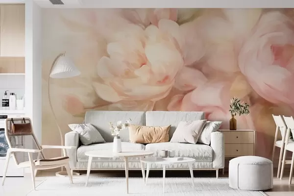 Papier peint Pivoines rose pâle et crème estompées, imitant les coups de pinceau doux et picturaux, créant un arrangement floral texturé. N° w09556