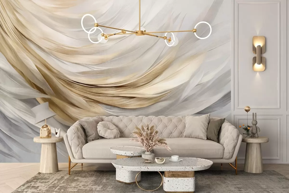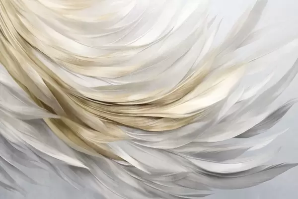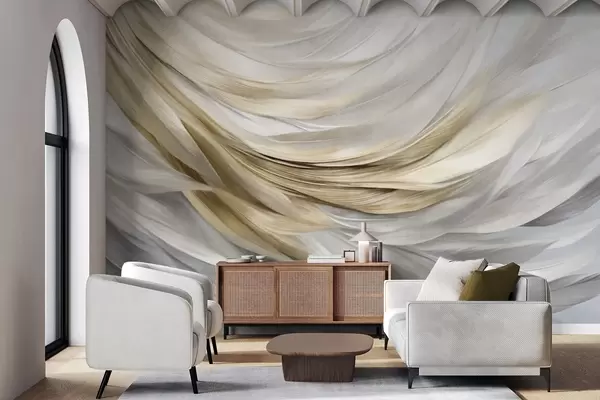 Papier peint Plumes abstraites texturées blanches, grises et jaunes, créant un motif fluide et superposé sur un fond clair. N° w09557