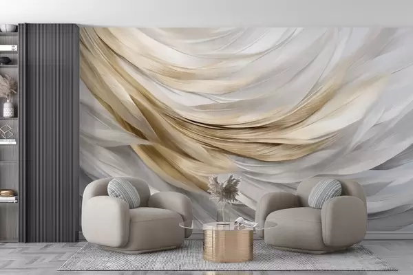 Papier peint Plumes abstraites texturées blanches, grises et jaunes, créant un motif fluide et superposé sur un fond clair. N° w09557