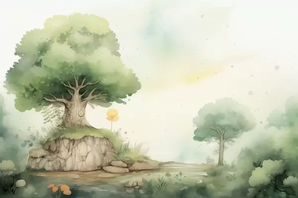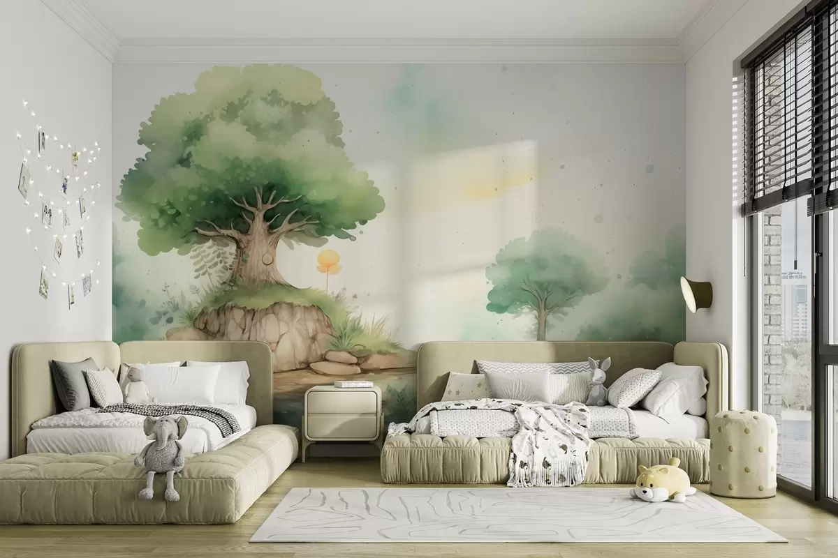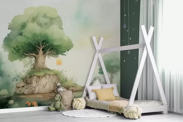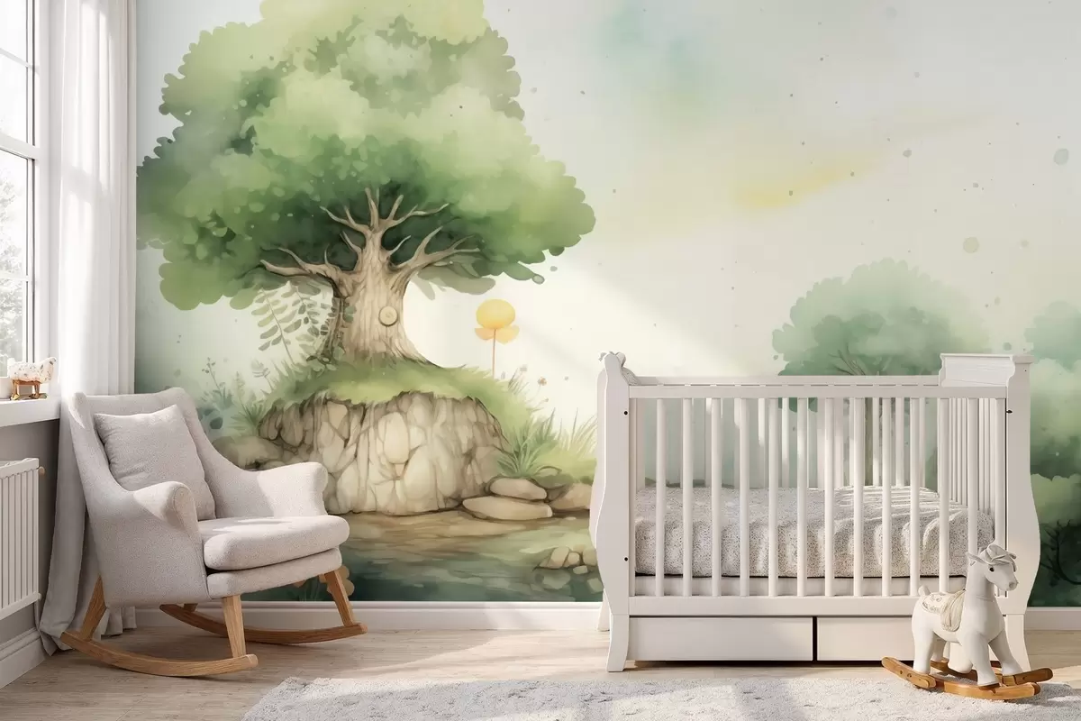 Papier peint Un monde féérique d'enfance dans un paysage forestier verdoyant, style aquarelle N° w09566