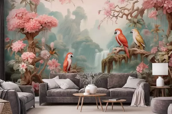 Papier peint Une forêt tropicale féérique avec des perroquets, des arbres en fleurs roses et une cascade. N° w09580
