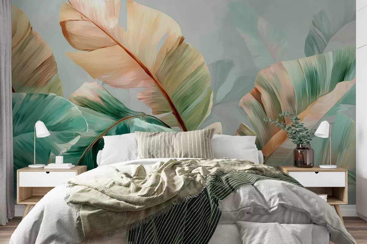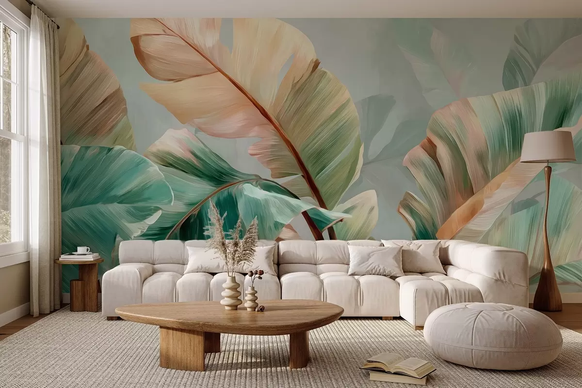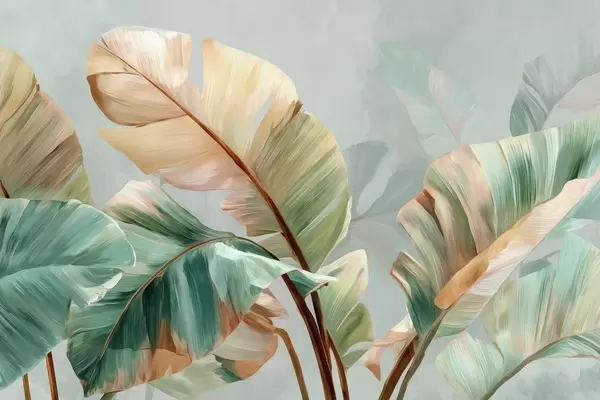 Papier peint Délicates feuilles de bananier tropicales dans des tons pastel jaune-vert N° w09581