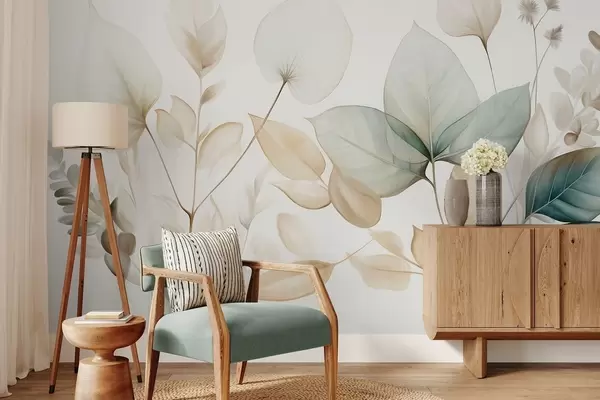 Papier peint Feuilles texturées translucides dans des tons discrets de beige et de bleu sarcelle, avec des tiges délicates sur un fond doux et clair N° w09583