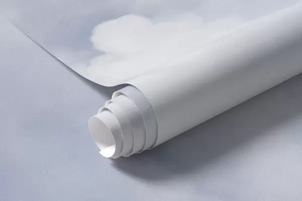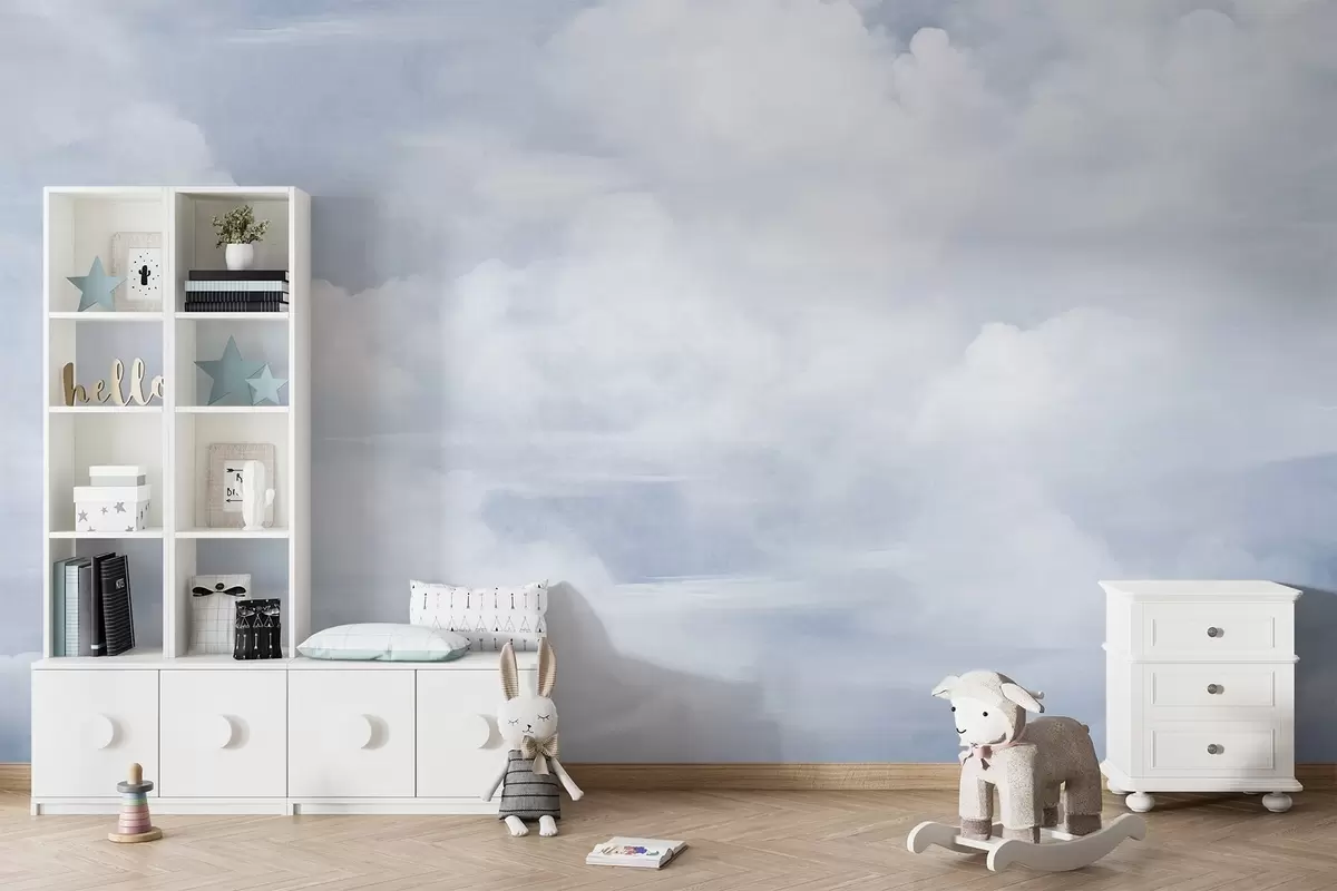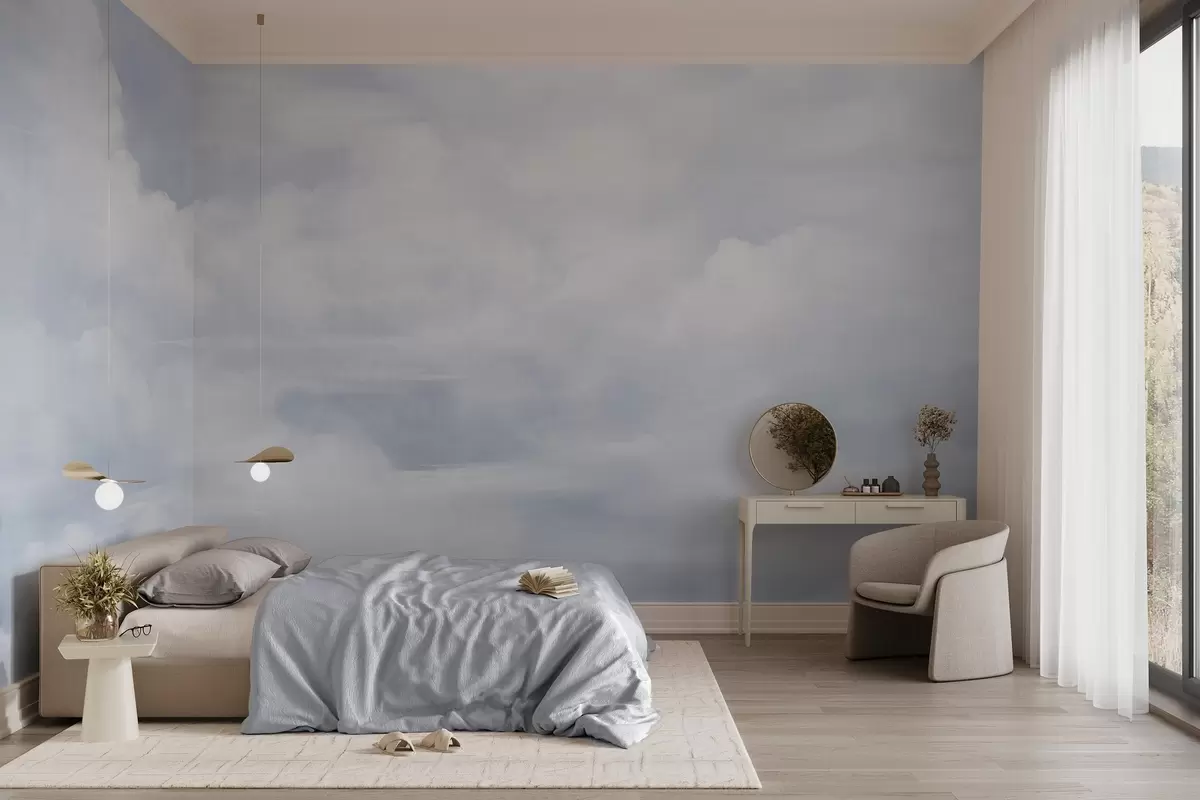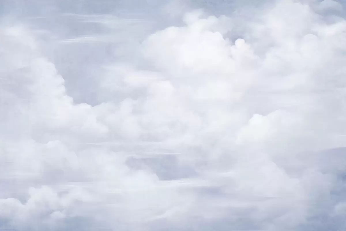 Papier peint Ciel pastel texturé rempli de nuages blancs, à l'esthétique douce et minimaliste. N° w09589
