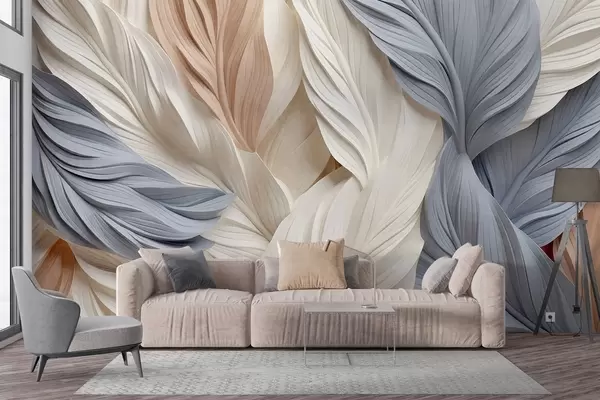 Papier peint Plumes abstraites et superposées dans des tons crème, beige et bleu clair, avec un aspect texturé et organique. N° w09603