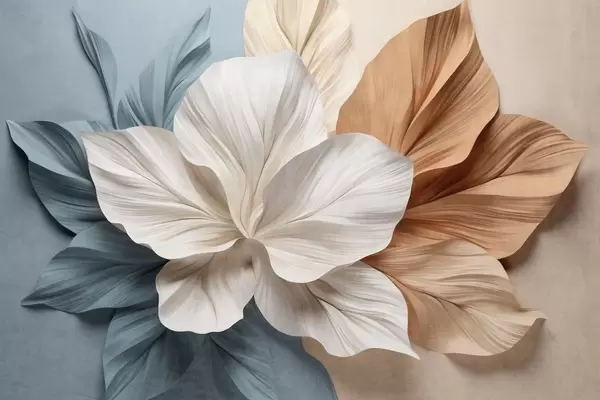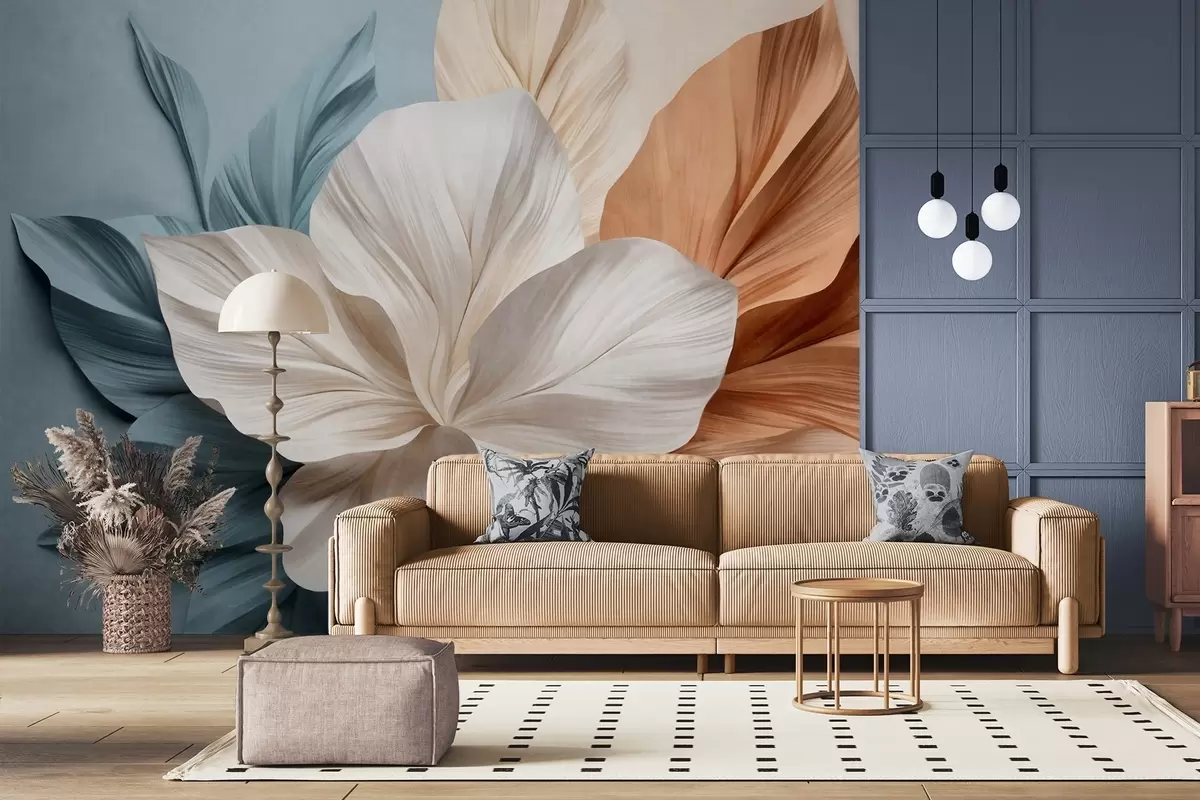 Papier peint Fleur abstraite à plusieurs pétales avec des feuilles texturées dans des tons pêche et bleu, fond doux N° w09604