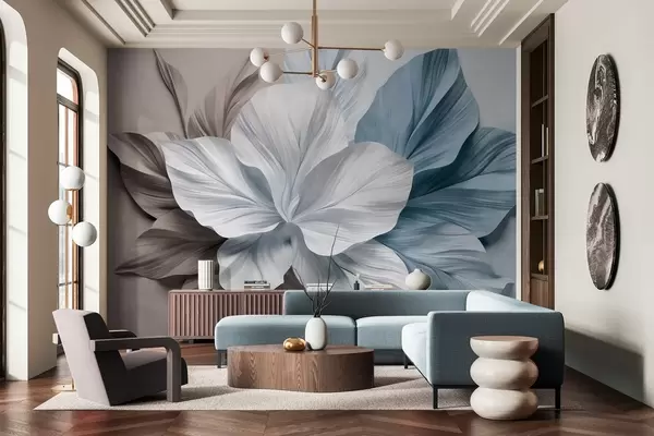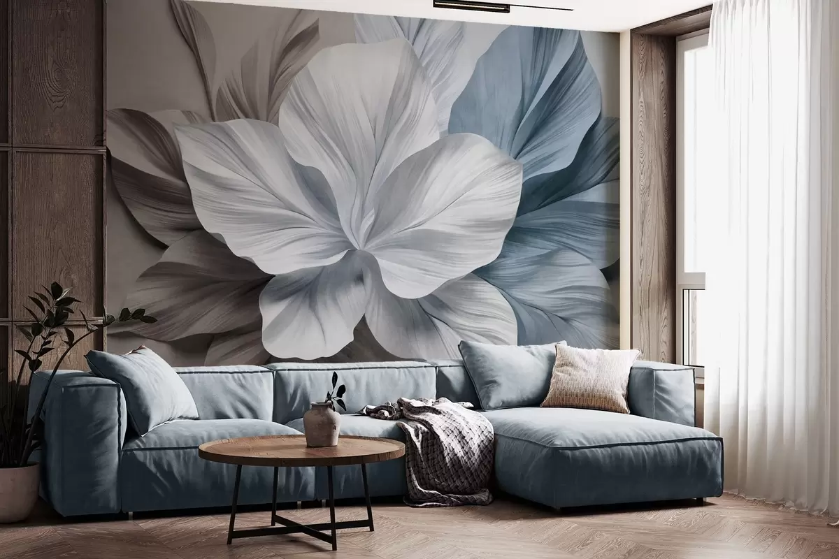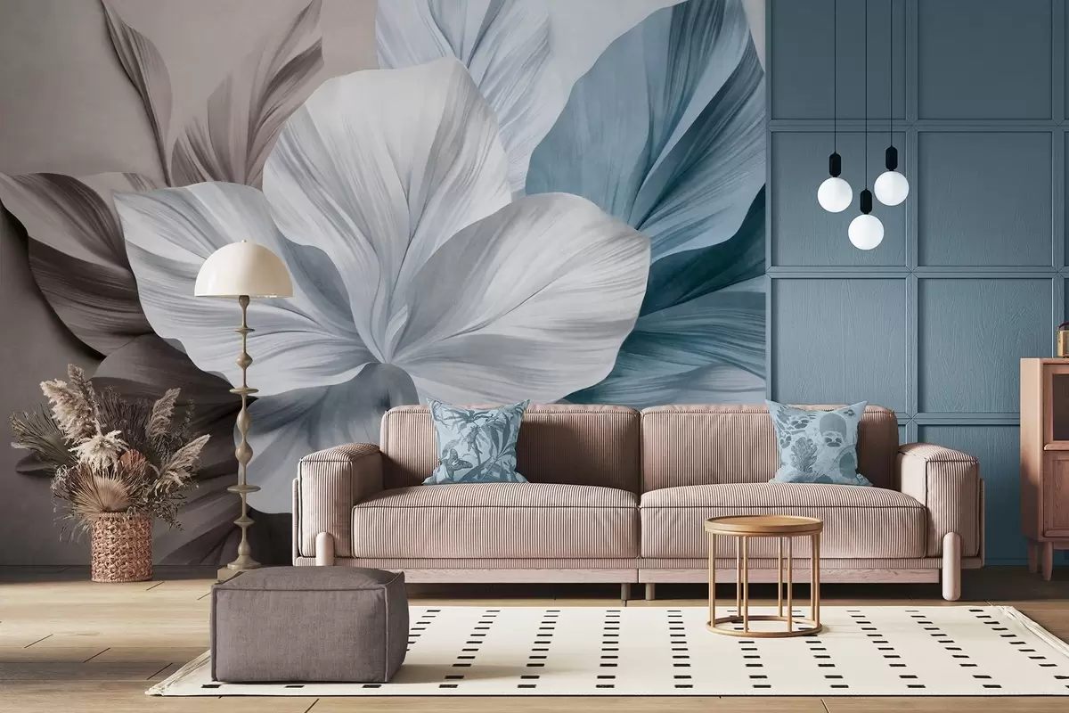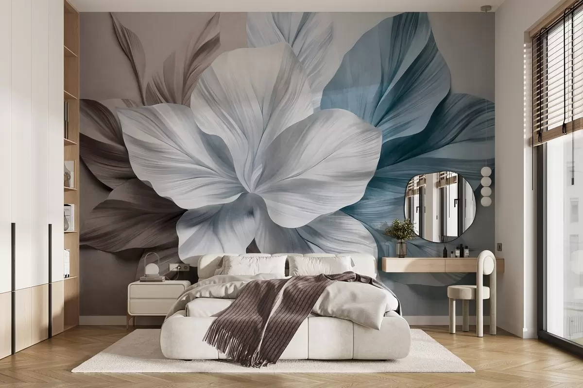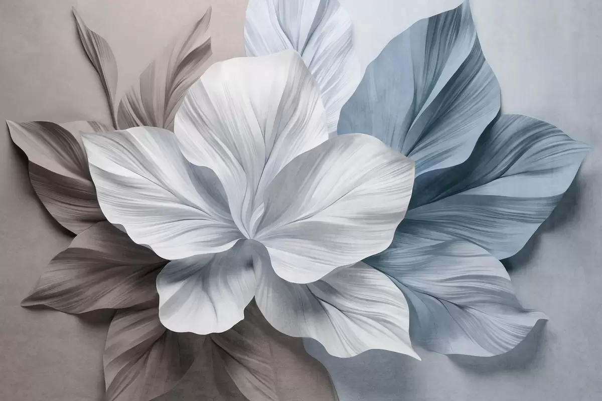 Papier peint Fleur abstraite à plusieurs pétales avec des feuilles texturées dans des tons de brun et de bleu, fond doux N° w09604v1