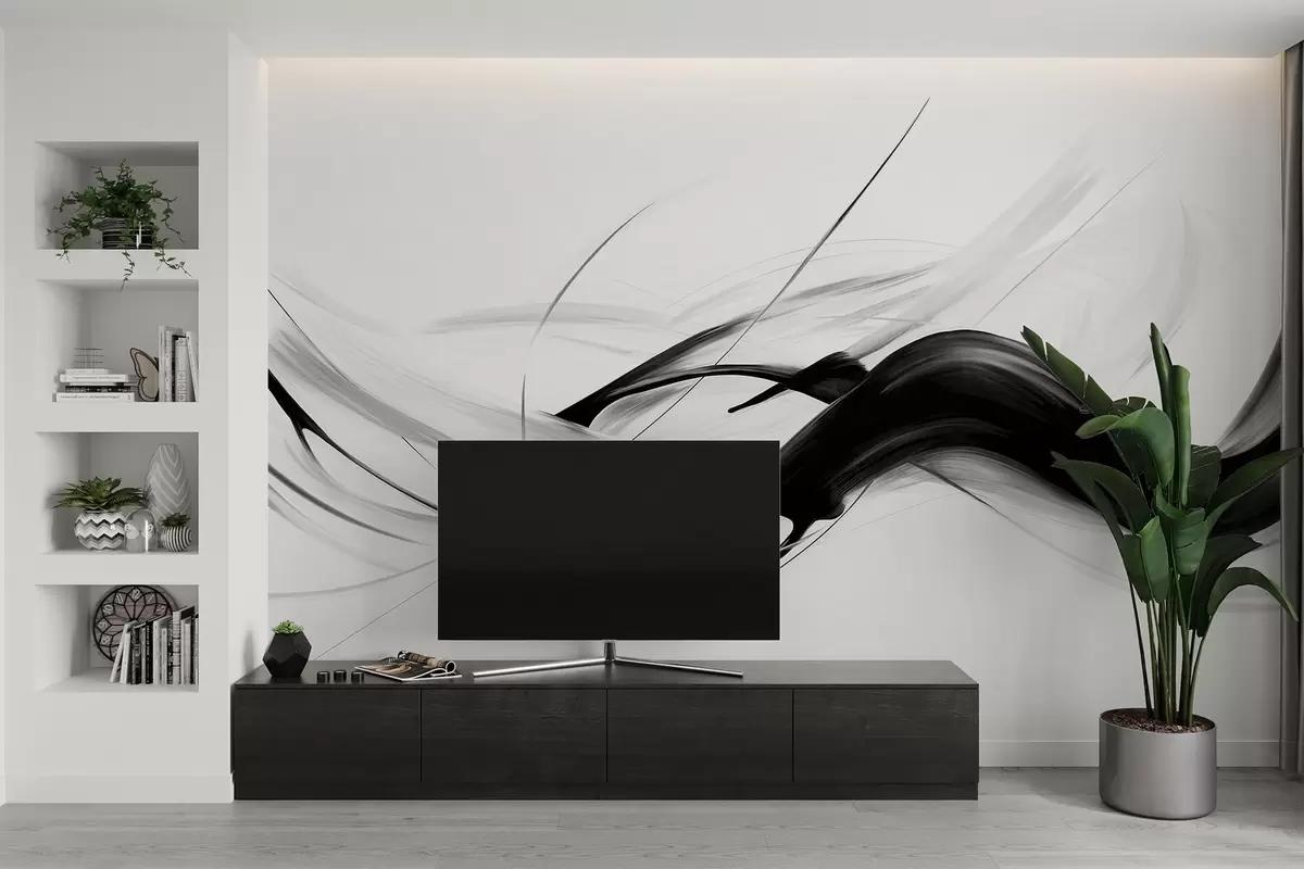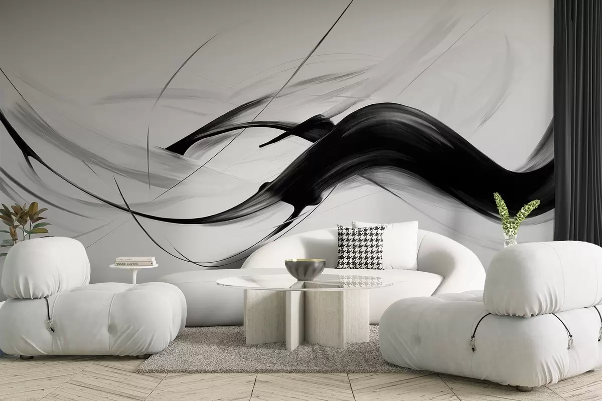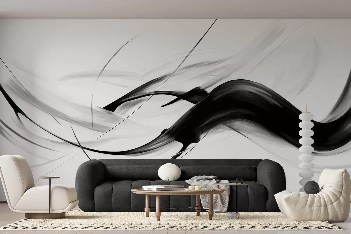 Papier peint Des traits abstraits en noir et blanc avec des lignes fines créent un design moderne sur fond clair. N° w09605