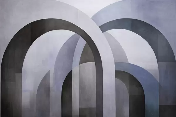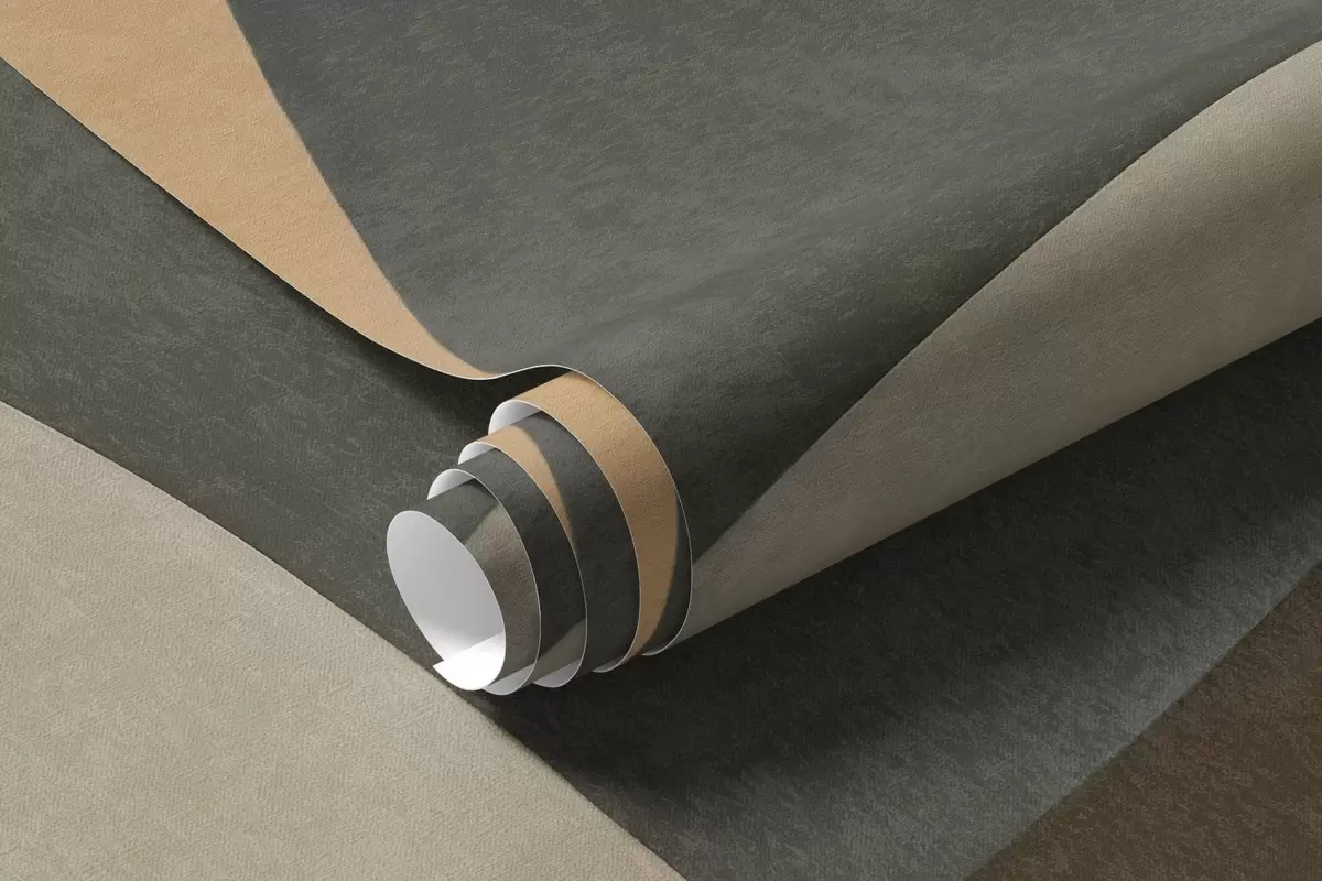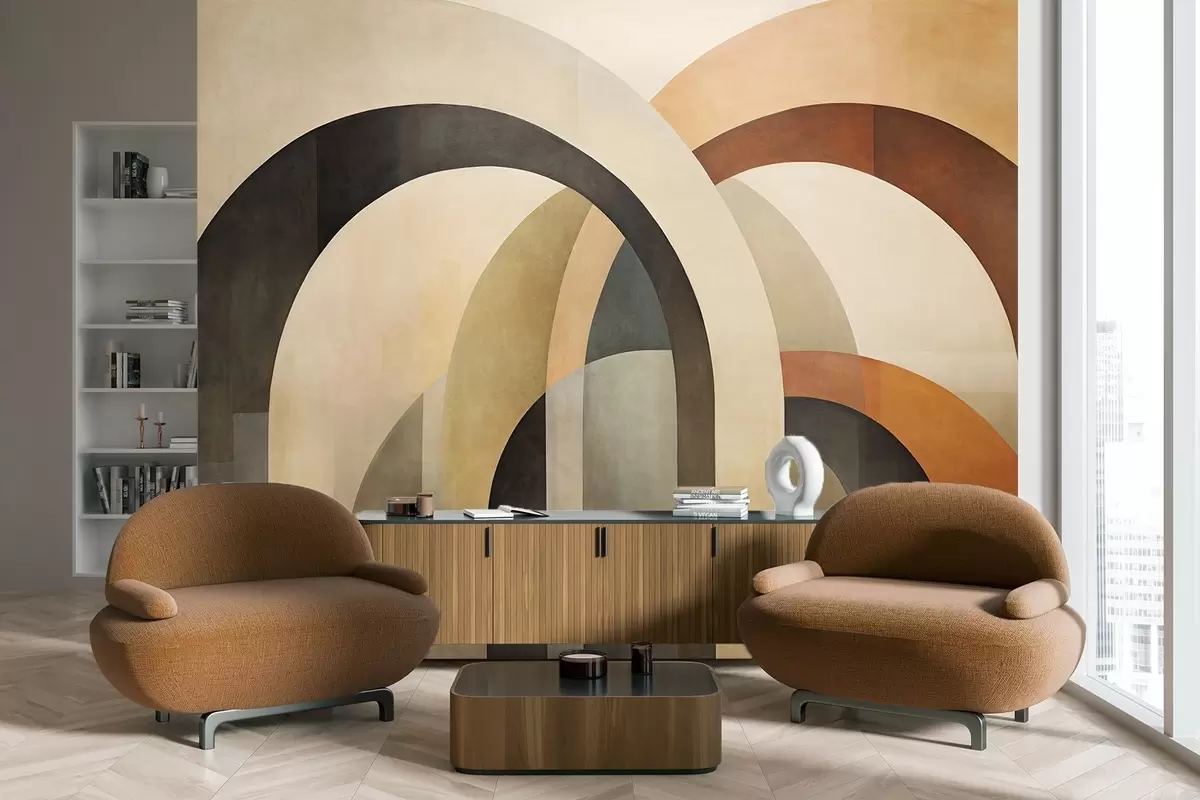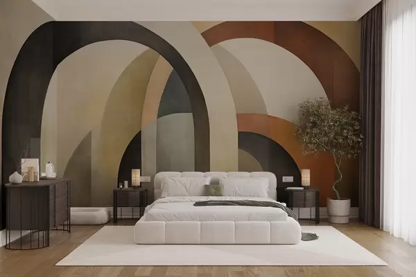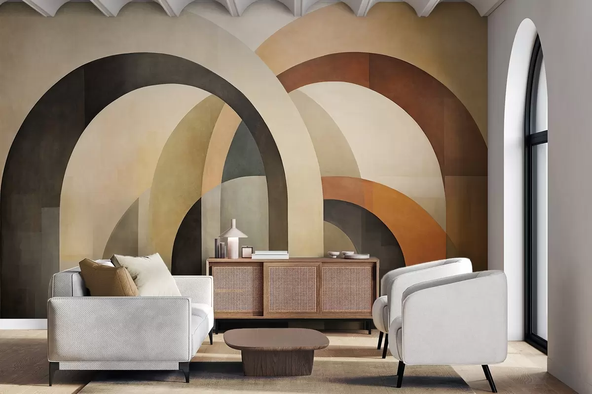 Papier peint Arcs géométriques abstraits texturés dans des tons terreux de beige, marron et gris, un design architectural moderne en couches. N° w09611