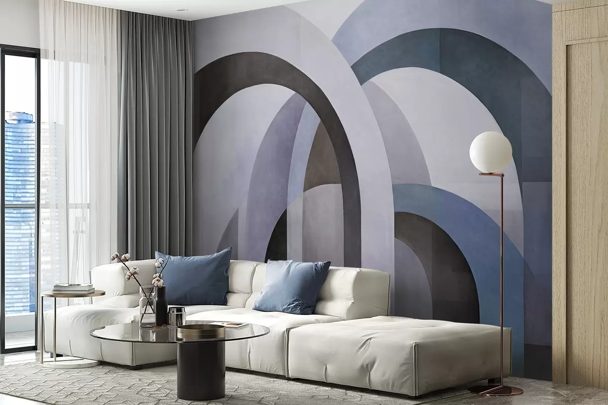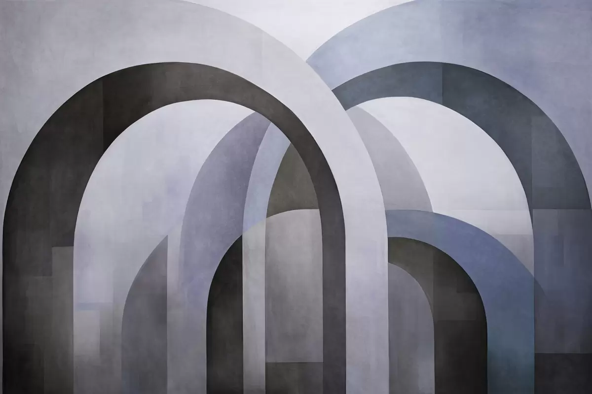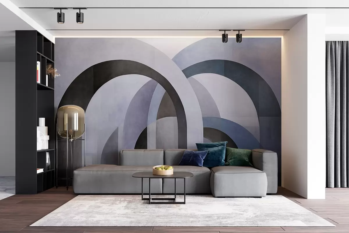 Papier peint Arcs géométriques abstraits texturés dans des tons de bleu, noir et gris, un design architectural moderne en couches. N° w09611v1