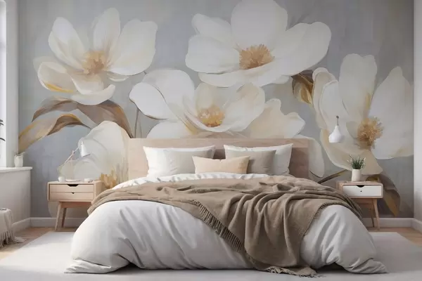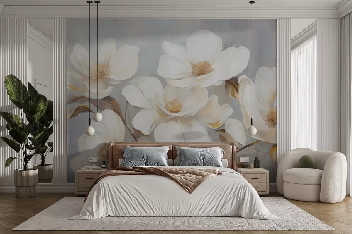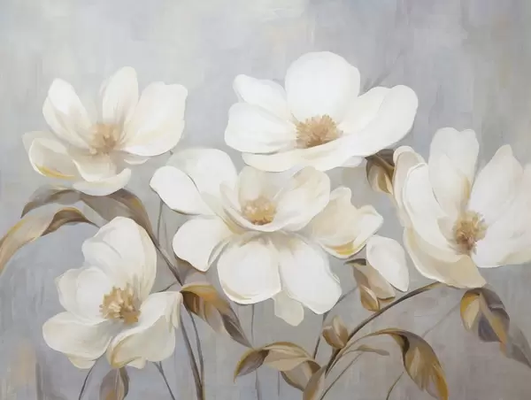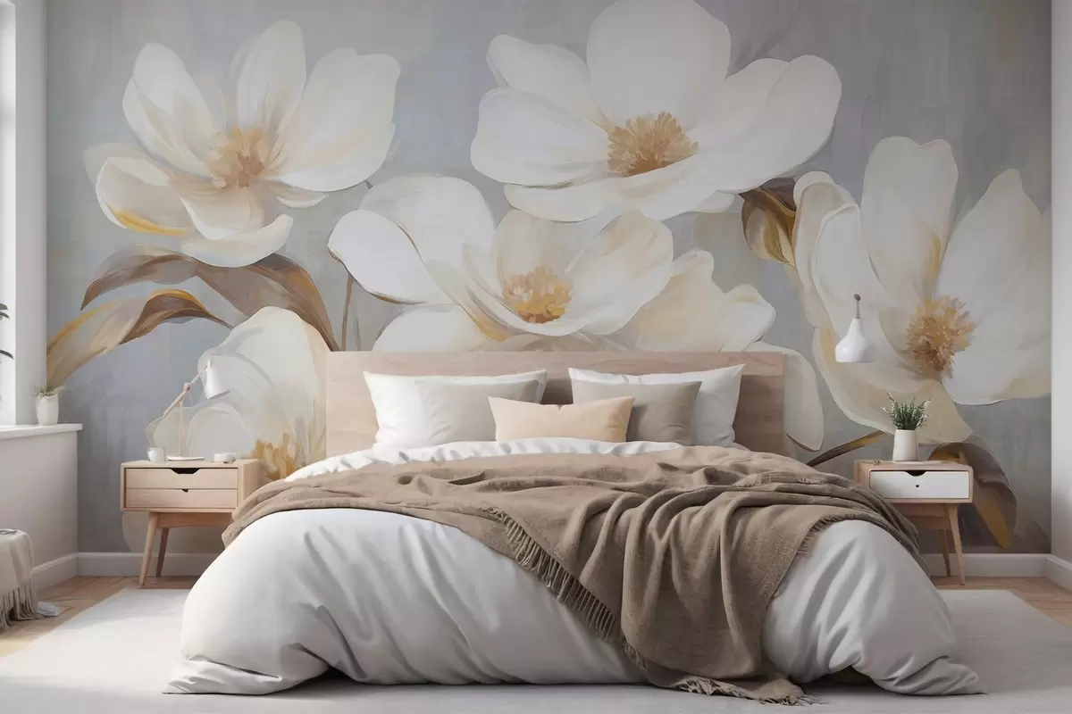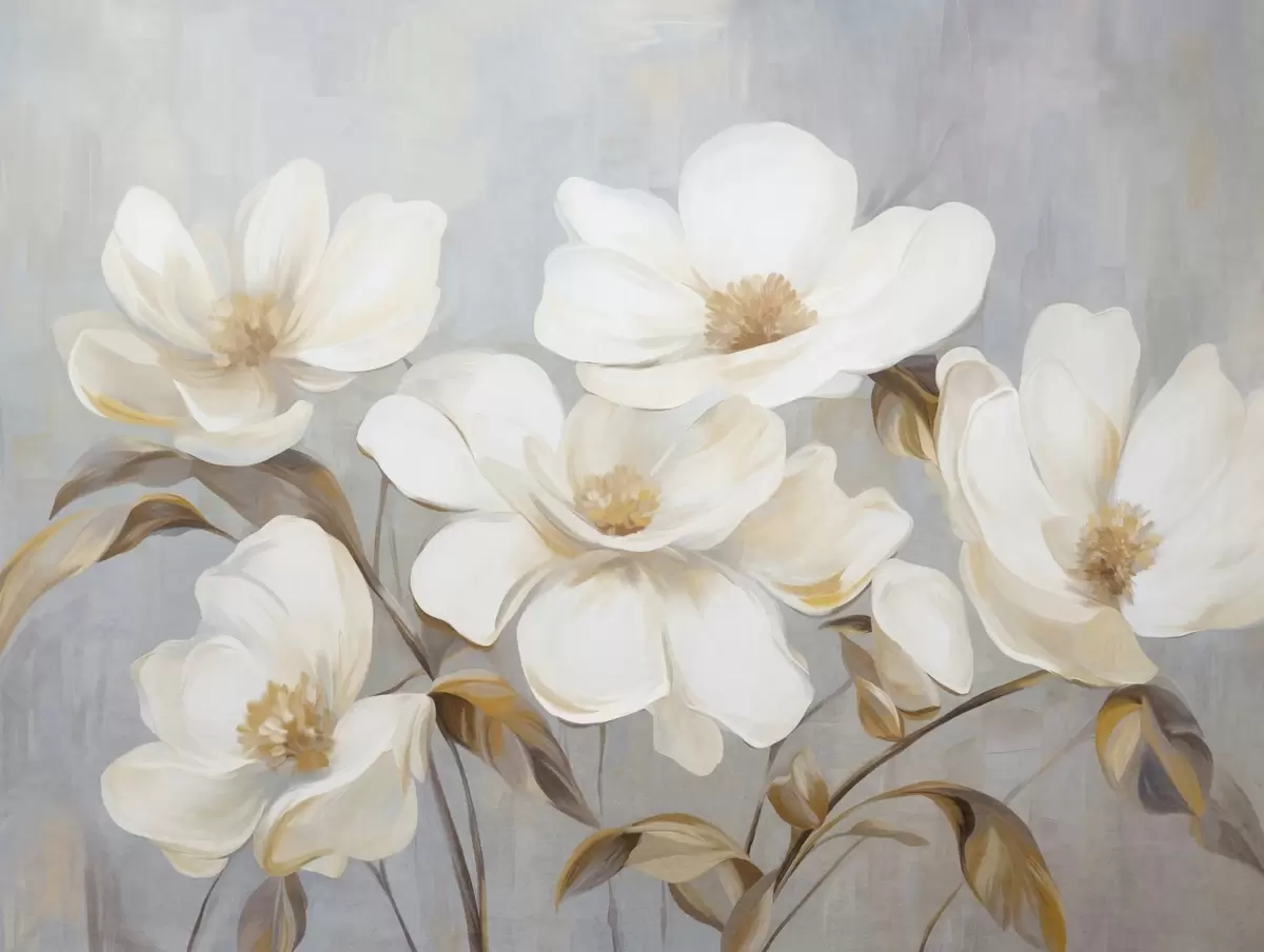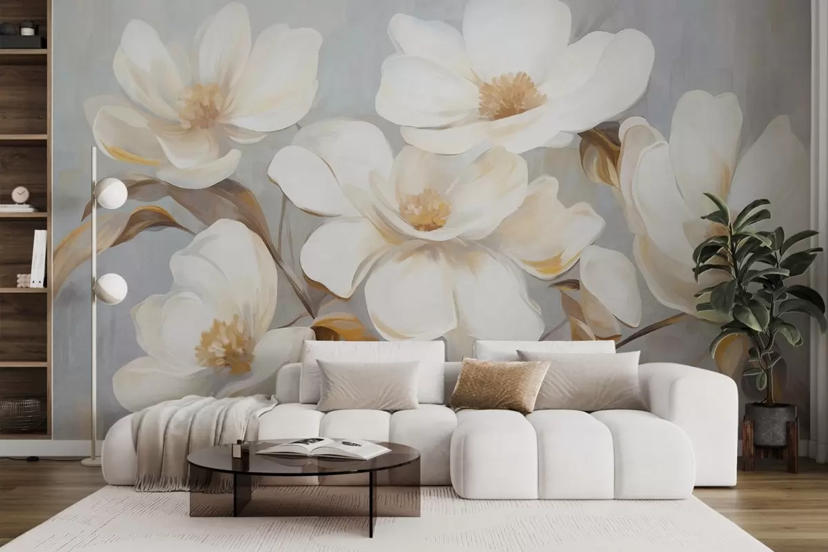 Papier peint Une imitation picturale texturée de plusieurs fleurs de magnolia blanches sur un fond pastel discret. N° w09612