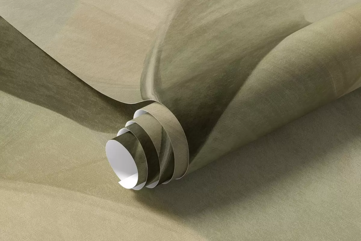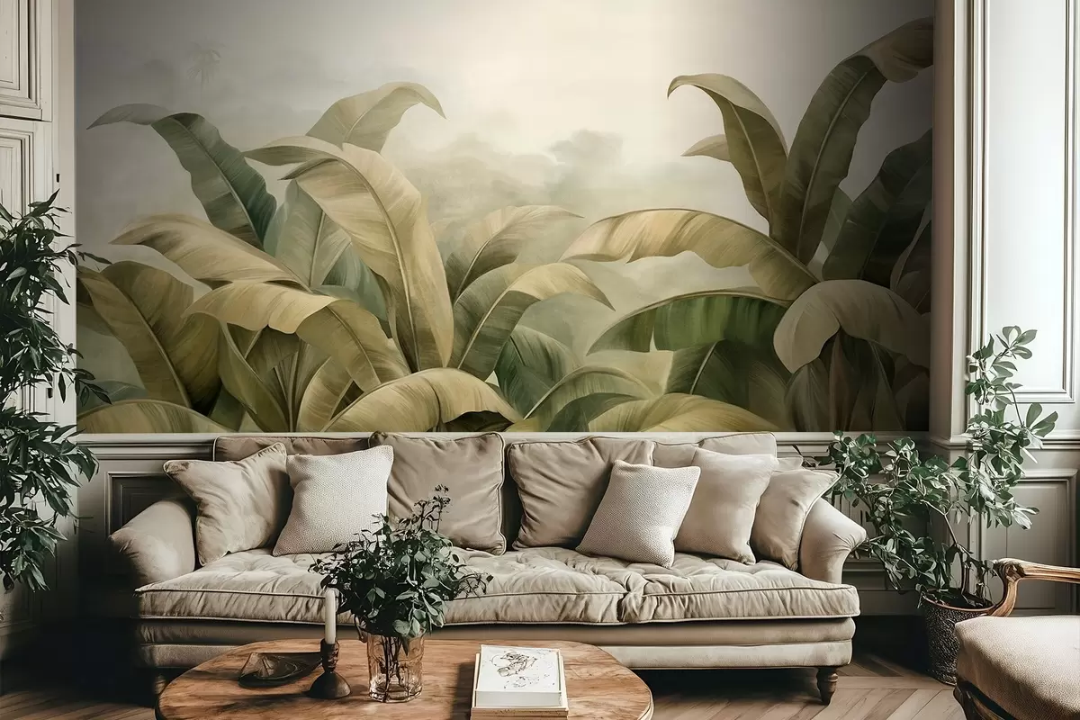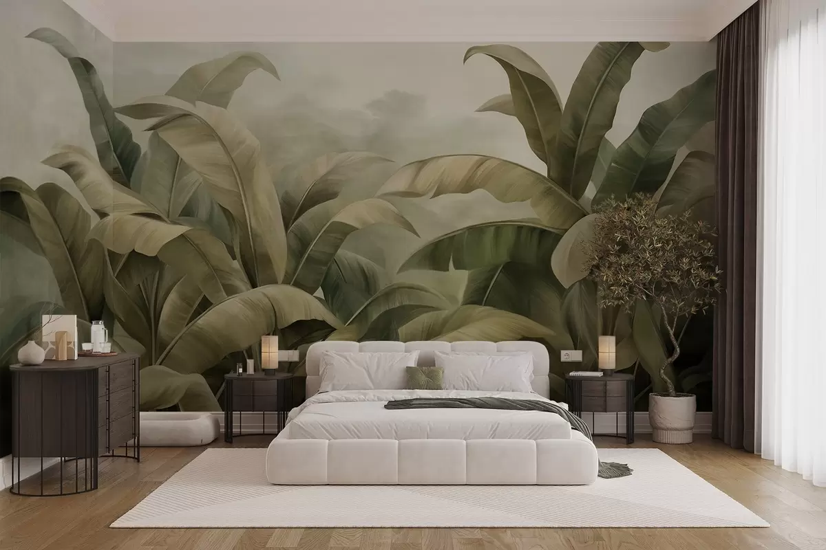 Papier peint Paysage de jungle dense et texturé avec de grandes feuilles de bananier dans des tons verts et beiges discrets. N° w09613