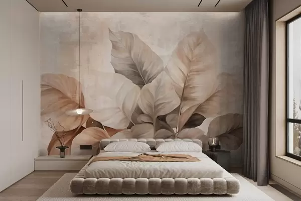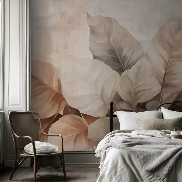Papier peint Peinture texturée imitant de grandes feuilles brun clair sur un fond neutre, avec des coups de pinceau subtils. N° w09614
