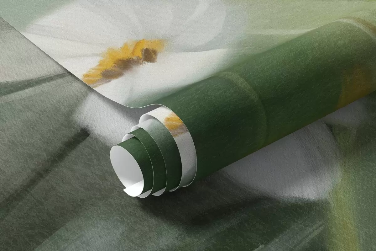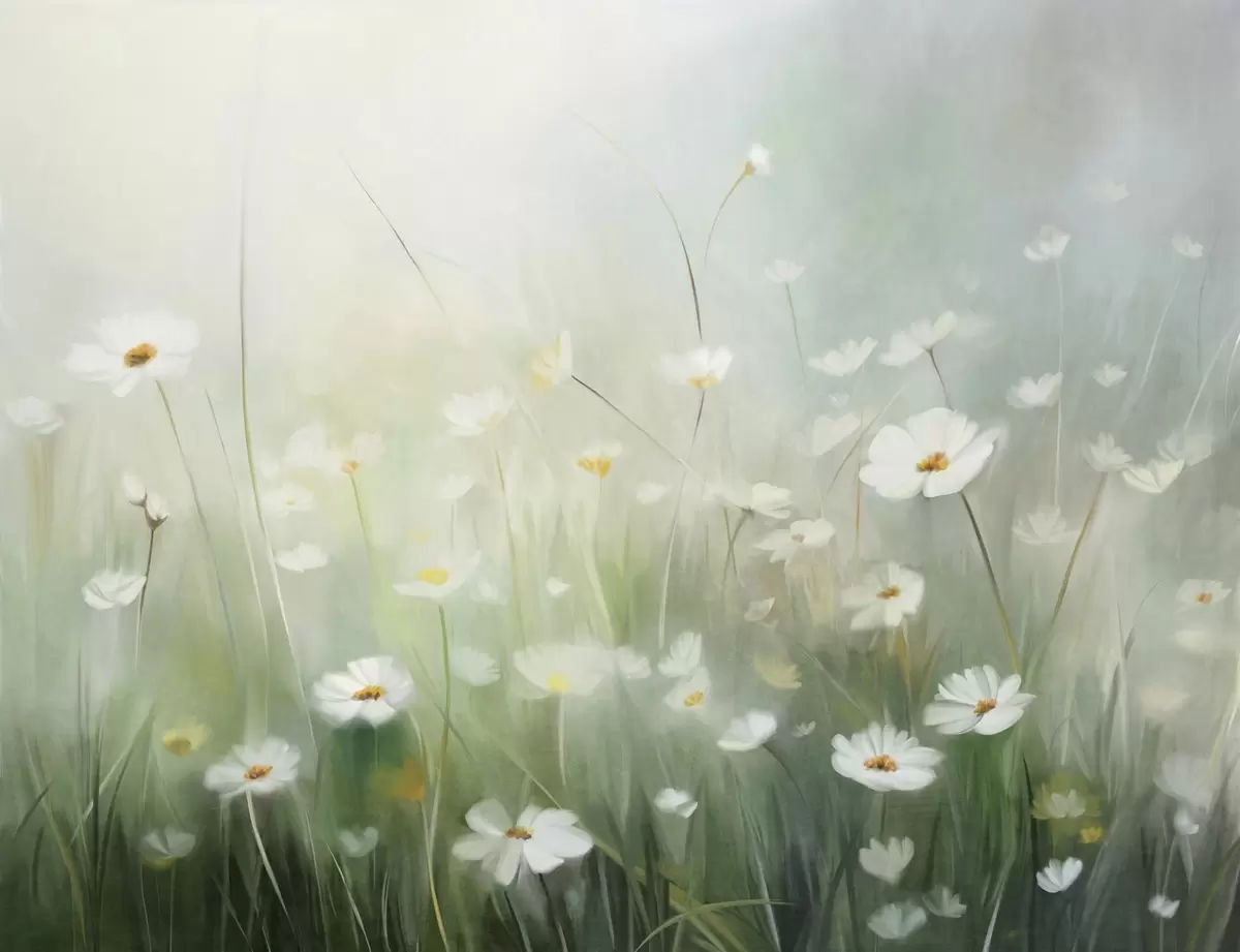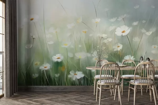Papier peint Champ abstrait de marguerites blanches avec de l'herbe verte et un arrière-plan doux et brumeux dans un style pictural N° w09619