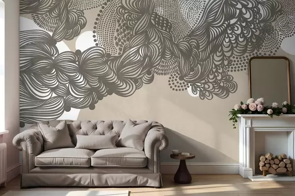 Papier peint Motif abstrait texturé sur fond beige, avec des lignes complexes et des textures pointillées. N° w09621