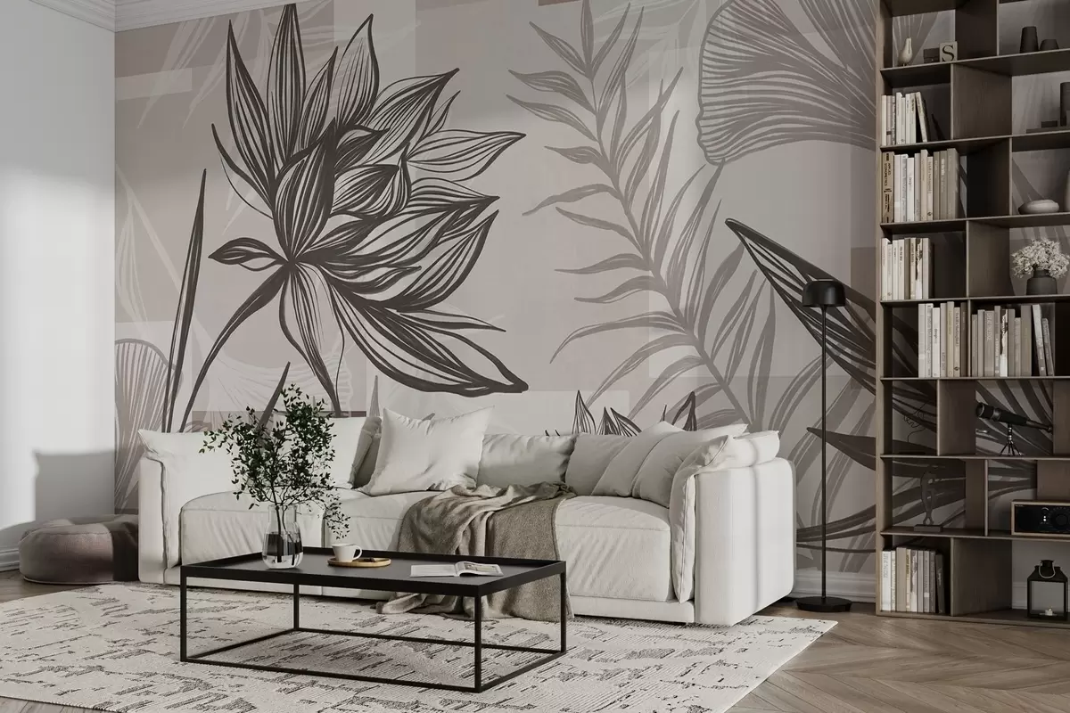 Papier peint Fleurs et feuilles stylisées texturées dans des tons de brun et de beige, avec un fond géométrique, dessin au trait N° w09629