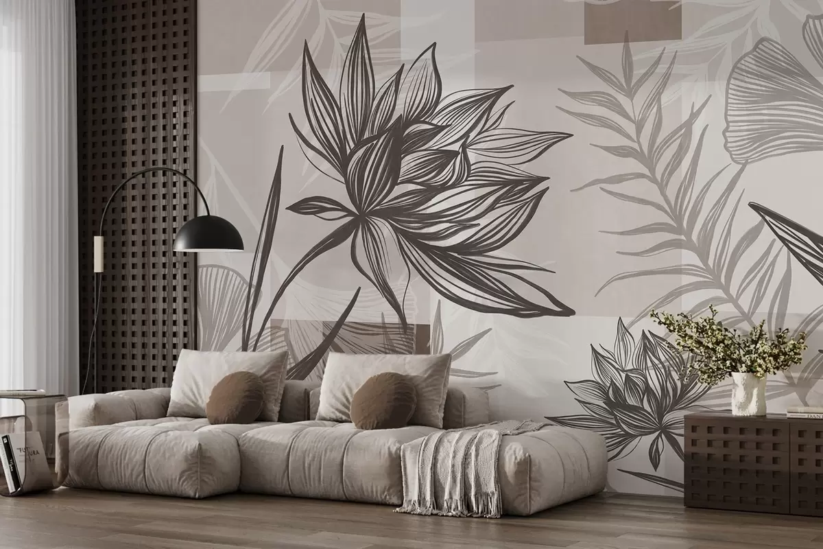Papier peint Fleurs et feuilles stylisées texturées dans des tons de brun et de beige, avec un fond géométrique, dessin au trait w09629