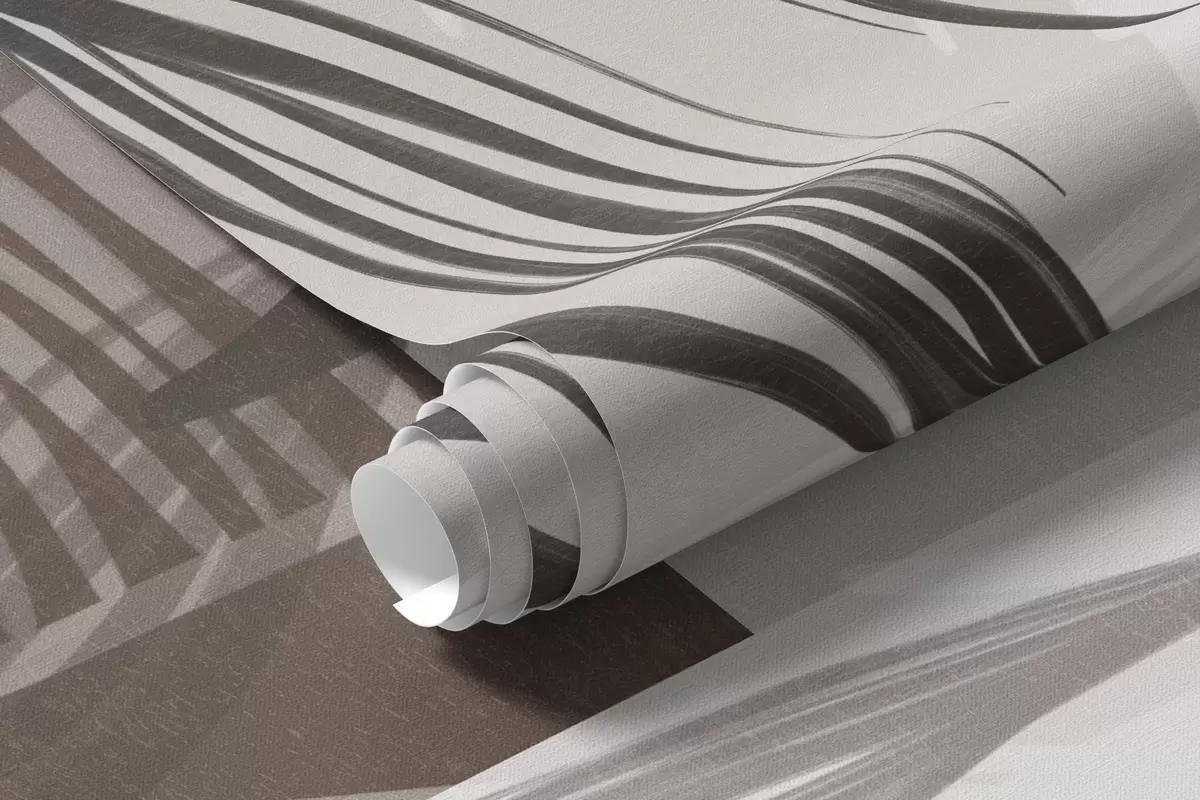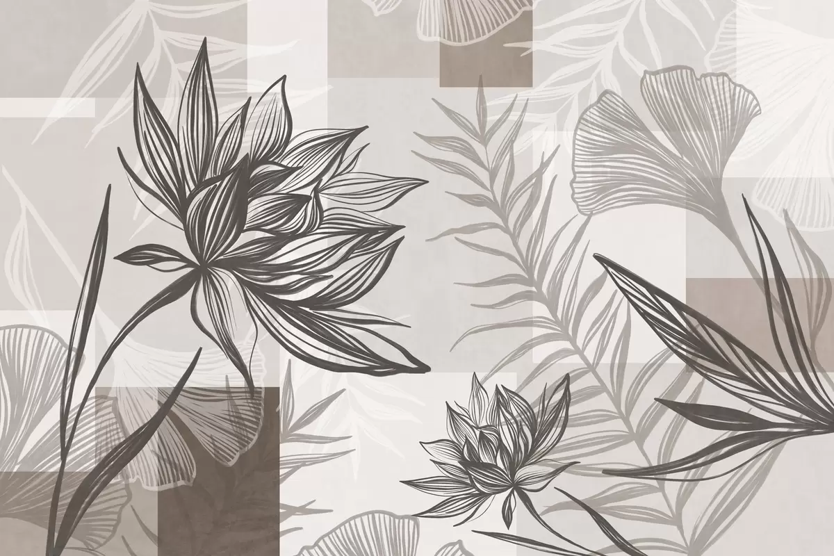 Papier peint Fleurs et feuilles stylisées texturées dans des tons de brun et de beige, avec un fond géométrique, dessin au trait N° w09629