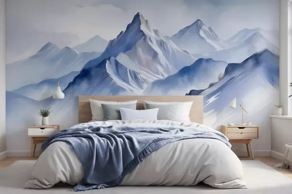 Papier peint Montagnes enneigées texturées avec un effet aquarelle doux et une palette de bleus et de blancs N° w09630