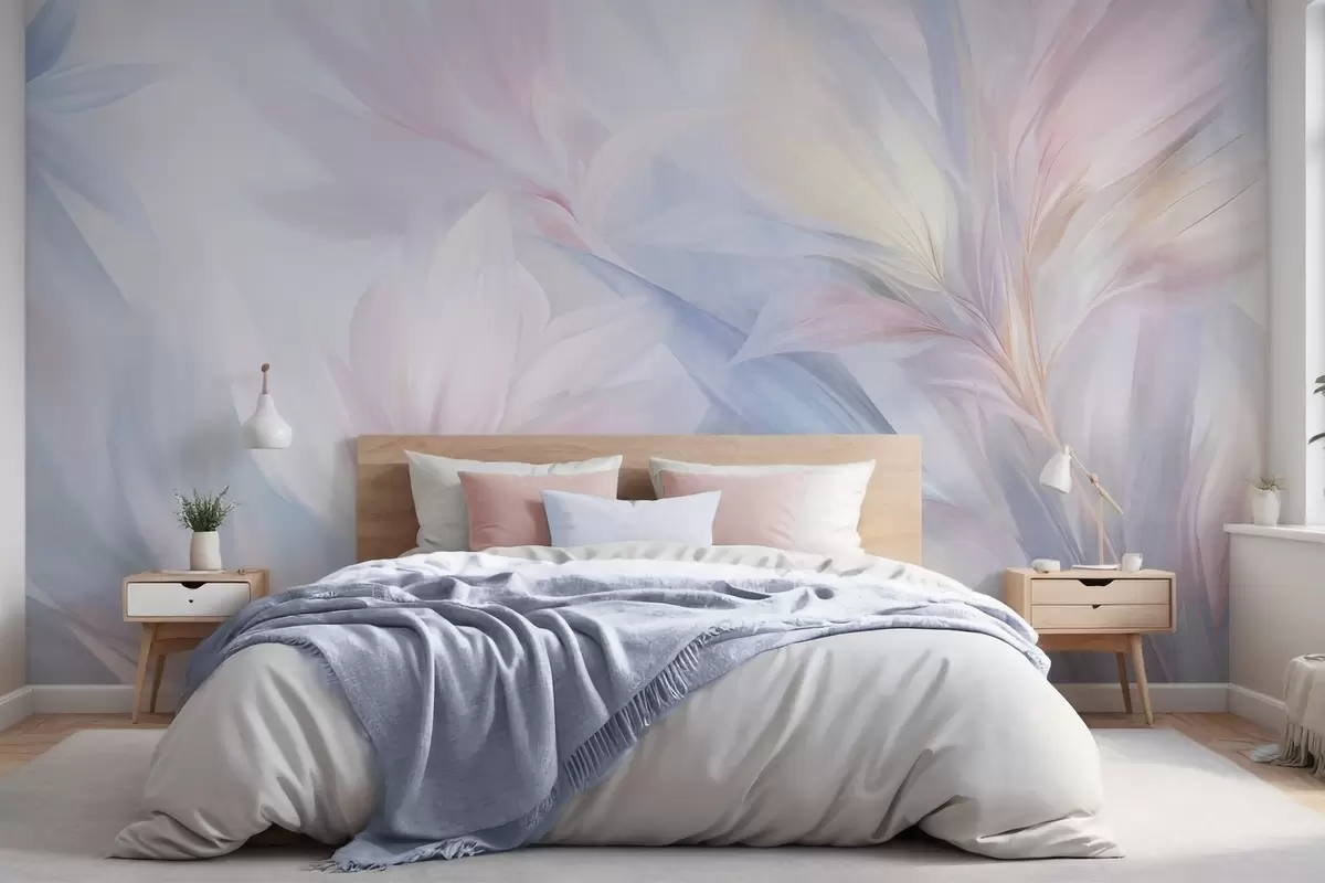 Papier peint Feuilles et plumes douces aux couleurs pastel dans les tons rose, bleu et jaune, imprimé abstrait et texturé N° w09634