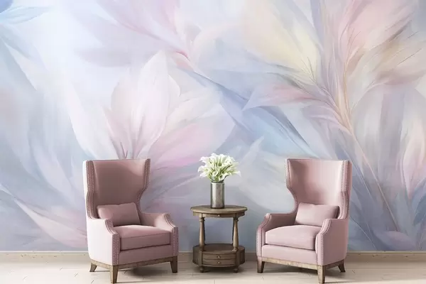 Papier peint Feuilles et plumes douces aux couleurs pastel dans les tons rose, bleu et jaune, imprimé abstrait et texturé N° w09634